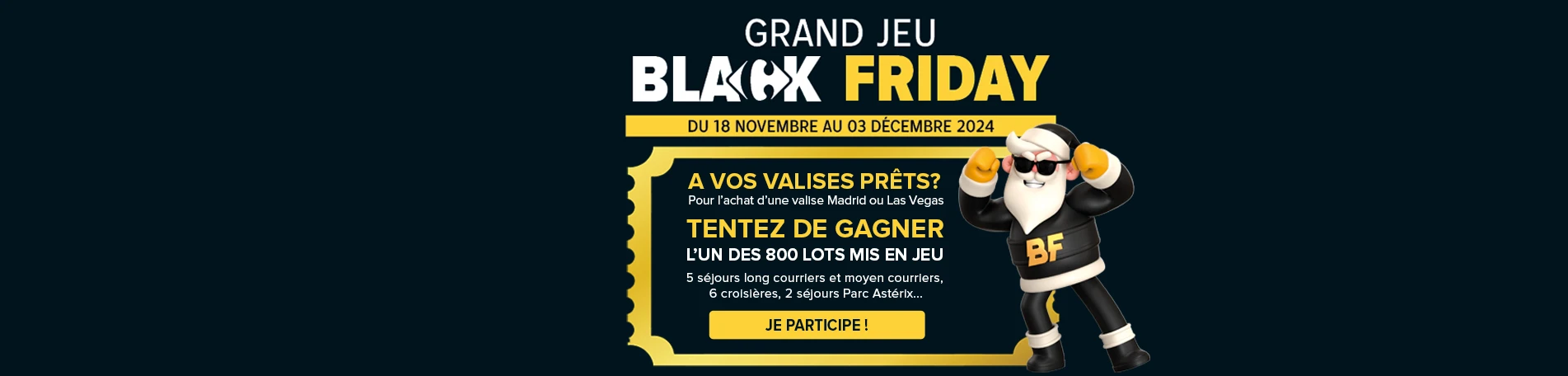 Pourquoi tant de promos pour le Black Friday ? Le Black Friday, ou vendredi noir, est un jour réputé pour faire des bonnes affaires et, pourquoi pas, commencer les achats de Noël. Carrefour Voyages participe à cet évènement international en vous proposant des offres Black Friday voyage. Plus qu'un jour de promo Black Friday, profitez de la Black Friday week : toute une semaine de voyages en promotion et de bons plans voyages à ne pas manquer ! Retrouvez chaque année toutes nos offres Black Friday avec des réductions exceptionnelles : séjours à l'étranger pas cher, locations de vacances, campings ou circuit, vous trouverez vos vacances pas cher parmi ces offres Black Friday. Pensez à réserver vos vacances pour le Black Friday, mais n'hésitez pas trop longtemps, les super deals Black Friday ont un nombre de places limité... Foncez et choisissez un voyage Black Friday !