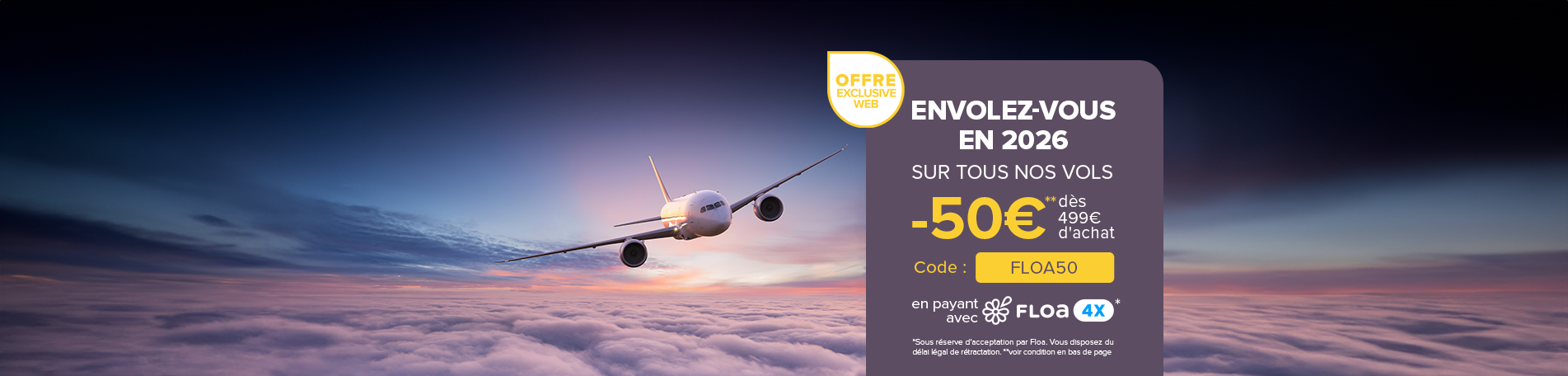 ** Offre FLOA valable du 16 au 31 décembre 2025, dans la limite des 100 premières commandes. Pour tout achat d’un vol sec depuis la page Vol d’une valeur minimum de 499€ et avec un départ à partir du 1er janvier 2026, bénéficiez de 50€ de remise immédiate avec le code FLOA50. *Sous réserve d'acceptation par Floa. Vous disposez du délai légal de rétractation.