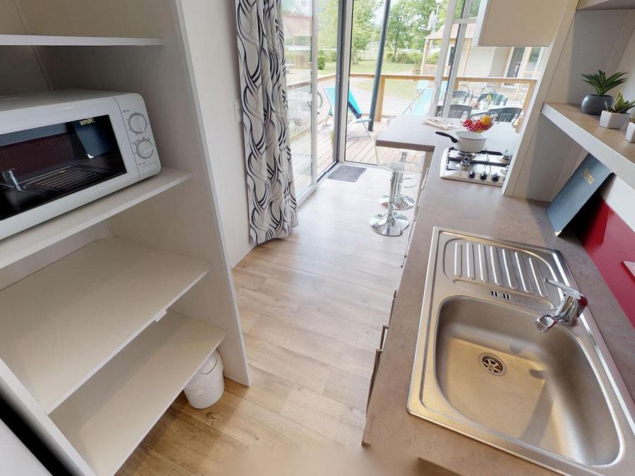 - Nouveauté 2020 au design moderne et épuré. 2 chambres dont 1 lit double et 2 lits simples côte à côte. Salle de bain et wc séparés. Double accès donnant sur une belle terrasse couverte façon estrade vers l'extérieur et joli coin salon et cuisine équipée vers l'intérieur. De nombreux rangements dont un cellier attenant à la cuisine.