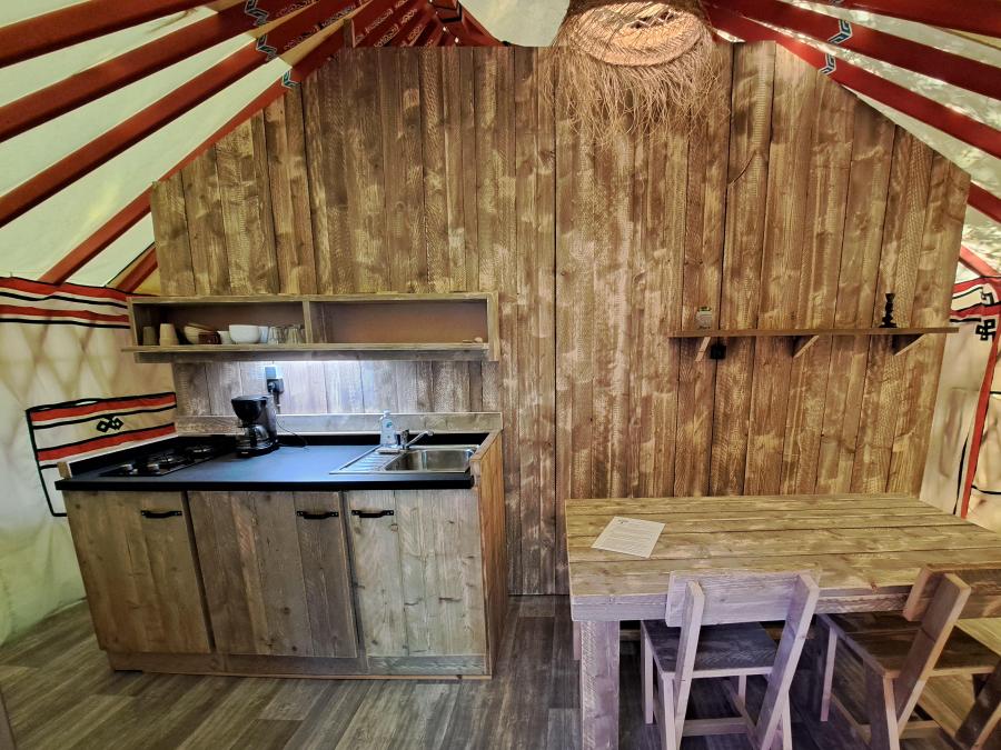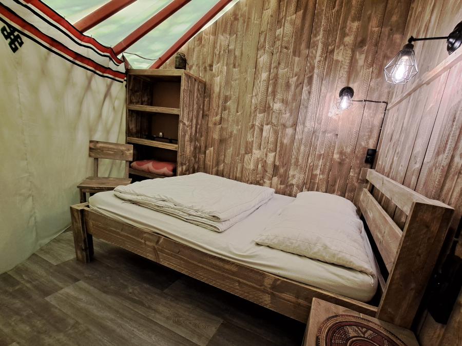 - La Yourte "WOOD", d'origine kirghize, est dotée de mobilier contemporain neuf en bois blanchi. Elle dispose de 2 chambres bien séparées avec couchages pour 5 personnes, dont deux lits doubles. Dans la 3ème pièce se trouve la salle à manger et la cuisine avec évier, réfrigérateur, micro-ondes, gaz, cafetière, bouilloire et vaisselle. L'extérieur, doté d'une table forestière et de transats, donne sur un vaste emplacement en herbe.