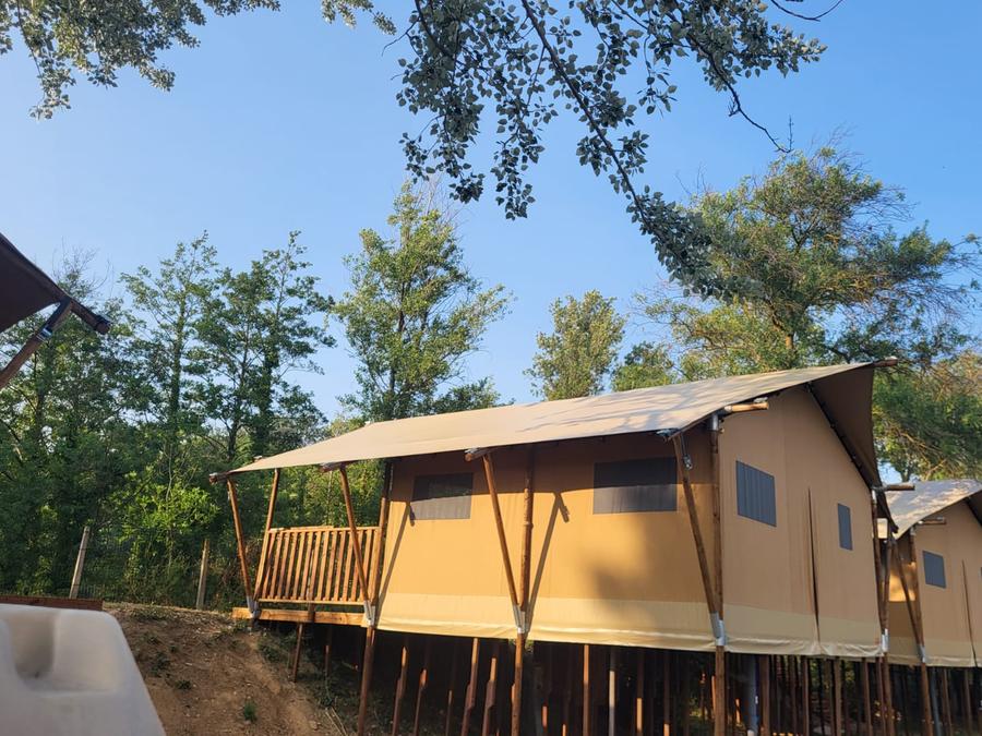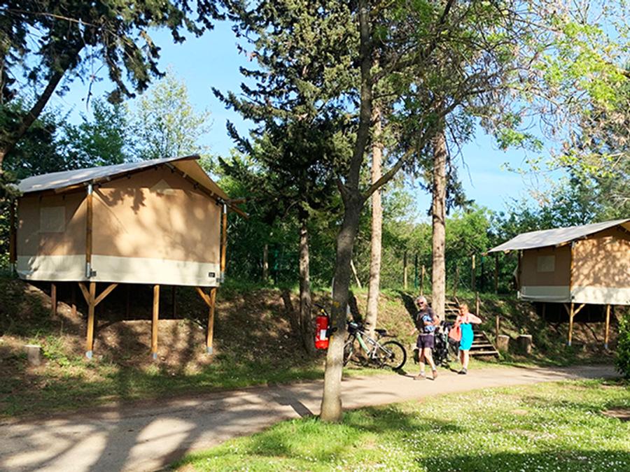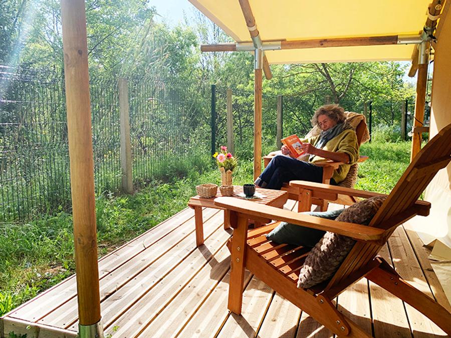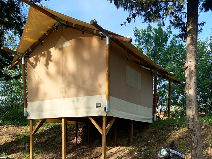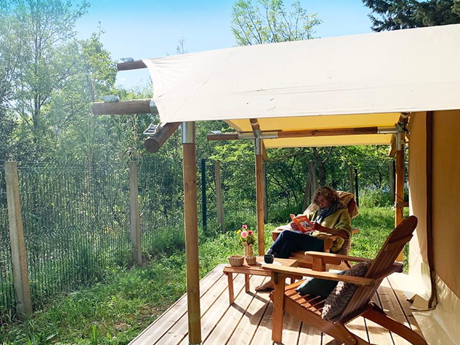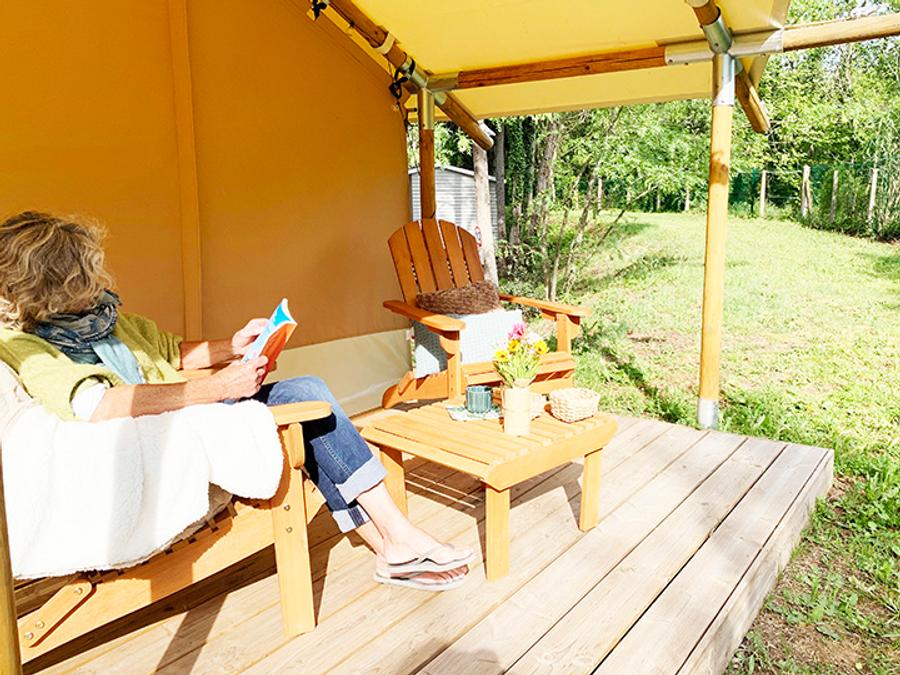 Tente en toile et en bois 4 personnes - Glamping Lodge PREMIUM RIVER 27m² - 2 chambres - TV - clim - terrasse couverte - vue rivière