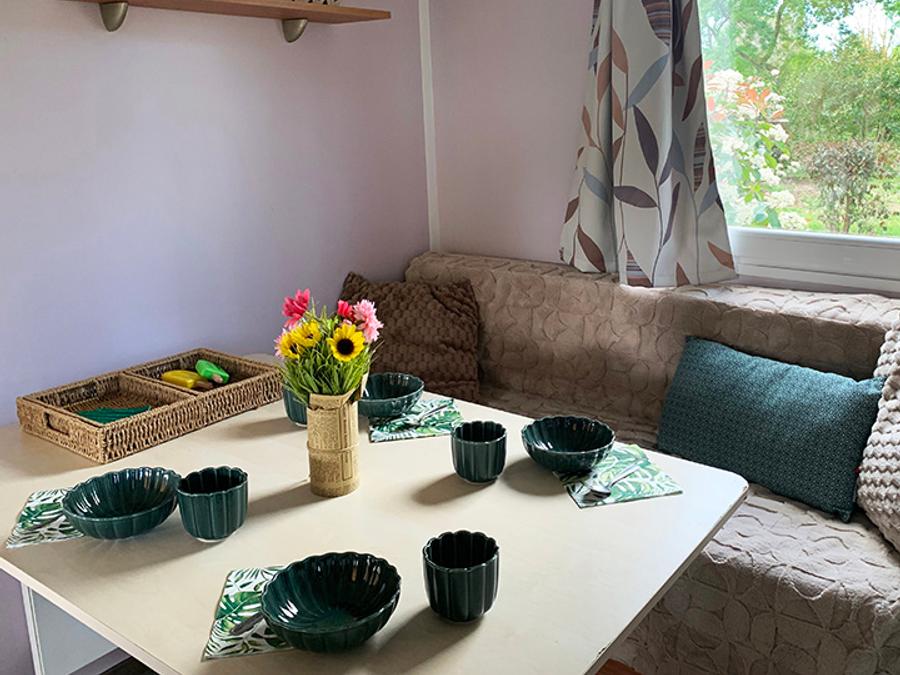 - Pièce de vie avec un coin repas avec table et chaises, un salon avec canapé, cuisine équipée avec plaques de cuisson gaz, frigo congélateur, four micro-ondes, machine à café à dosettes, bouilloire et grille-pain.