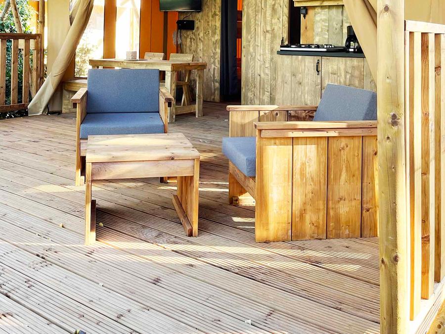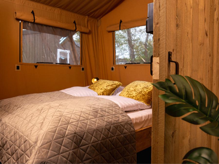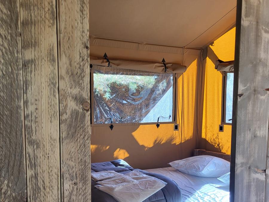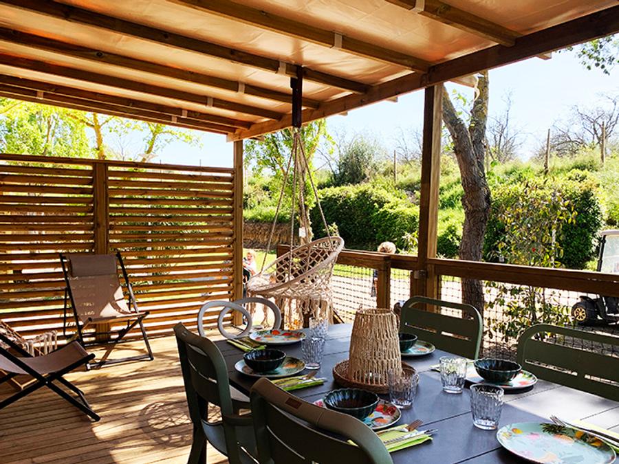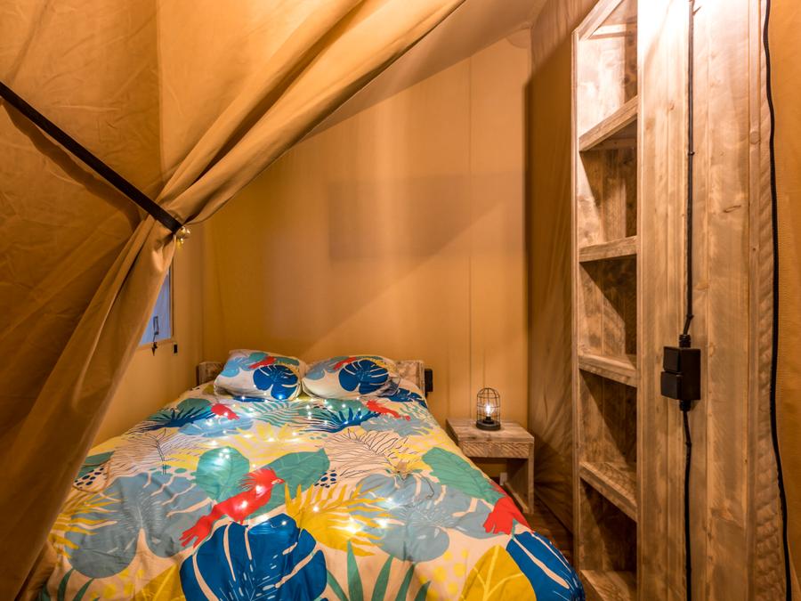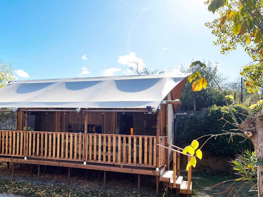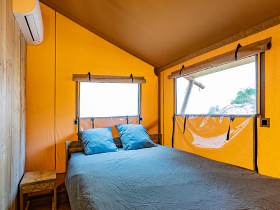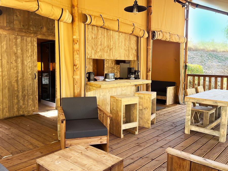 Tente en toile et en bois 4 personnes - Glamping Lodge PREMIUM 34m² - 2 chambres - TV - climatisation - terrasse couverte