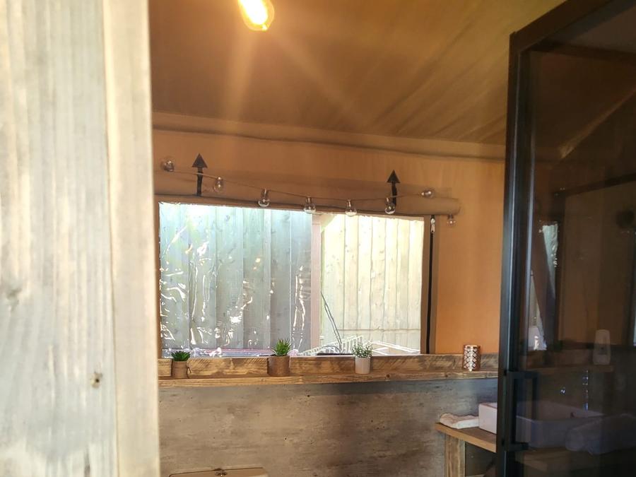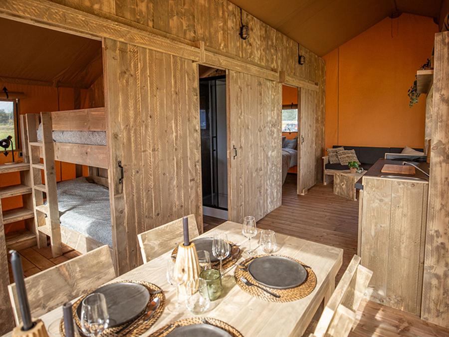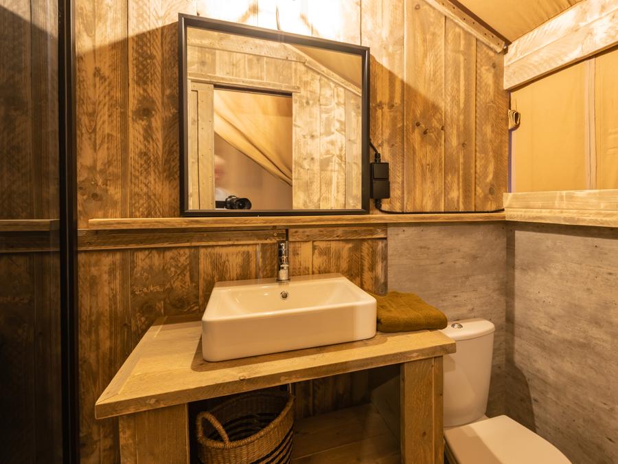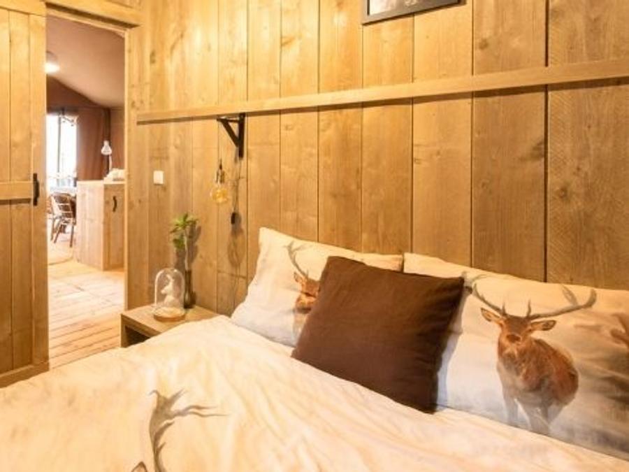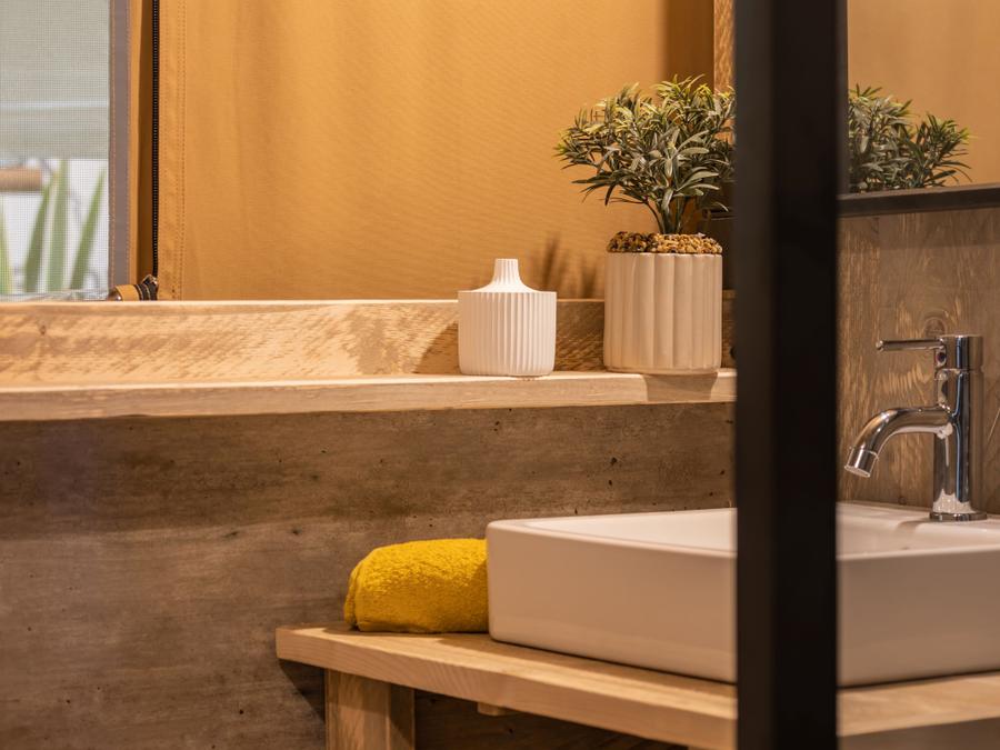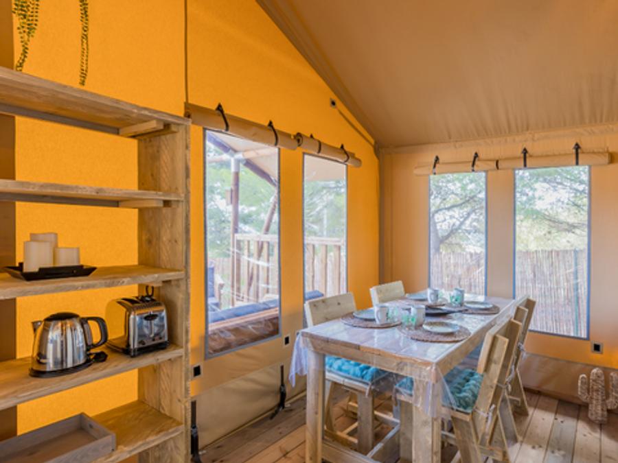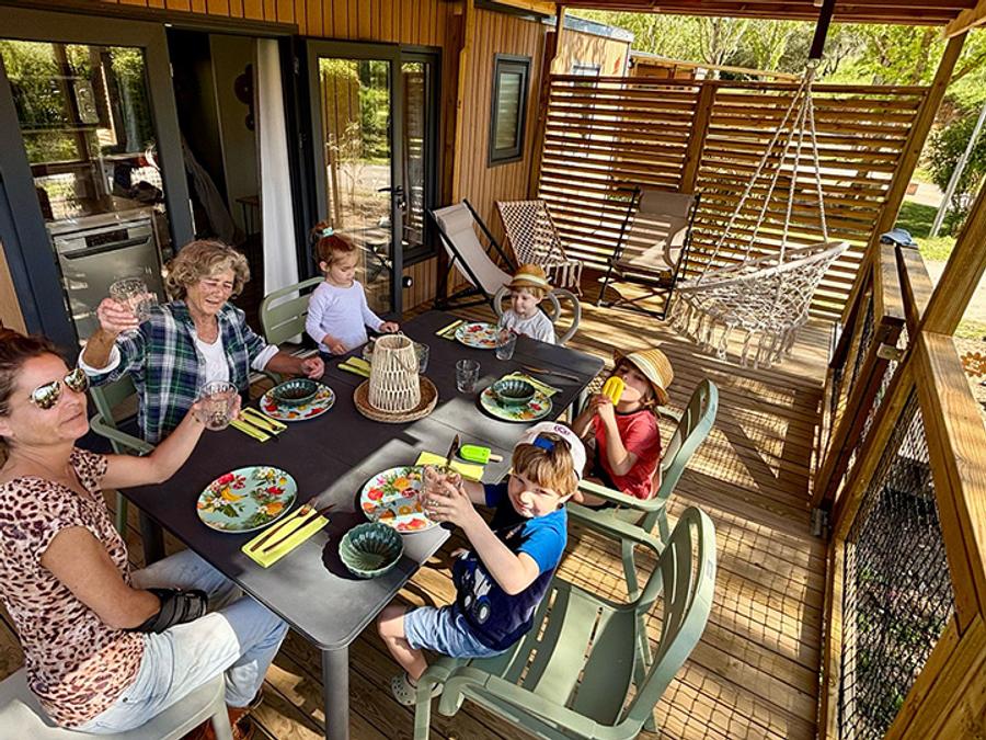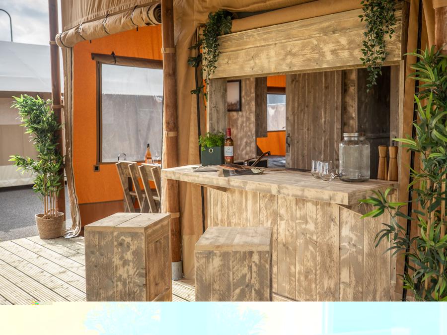 Tente en toile et en bois 4 personnes - Glamping Lodge PREMIUM 34m² - 2 chambres - TV - climatisation - terrasse couverte