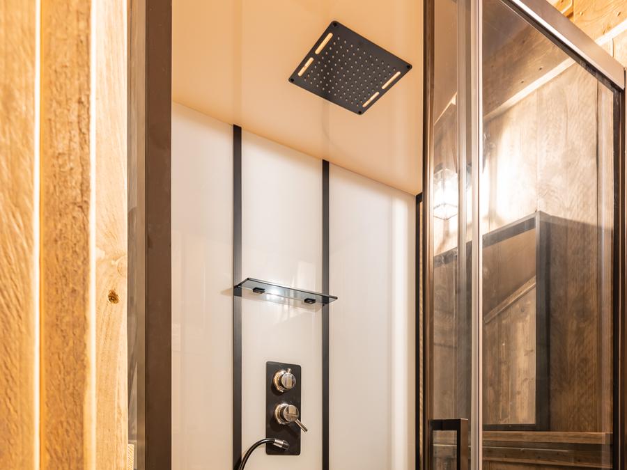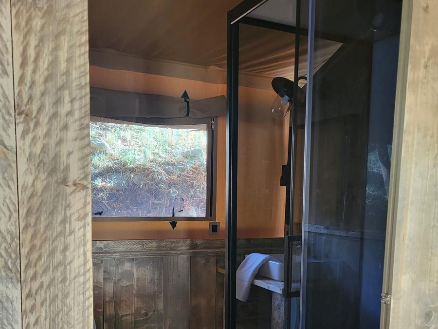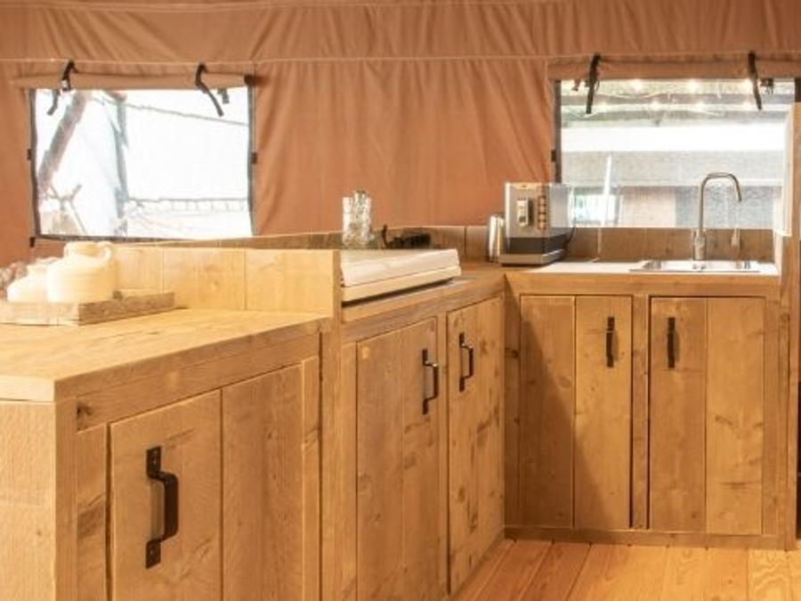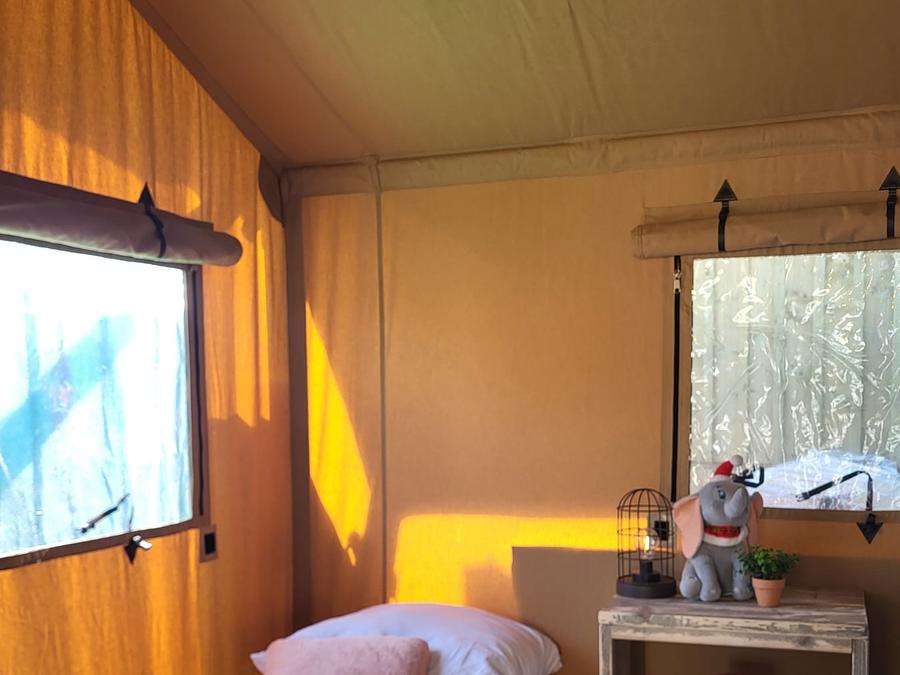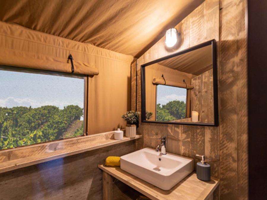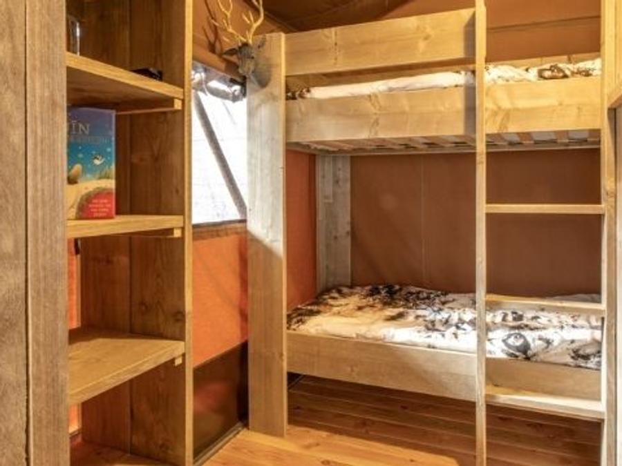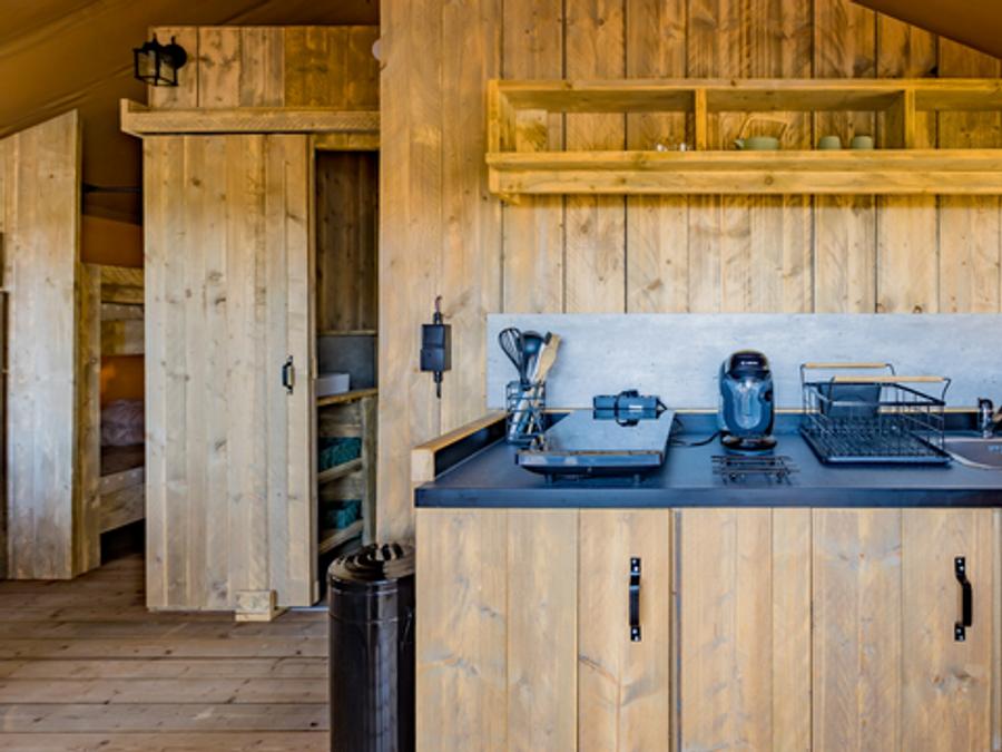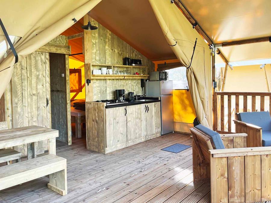 Tente en toile et en bois 4 personnes - Glamping Lodge PREMIUM 34m² - 2 chambres - TV - climatisation - terrasse couverte