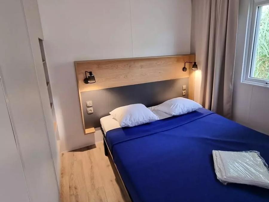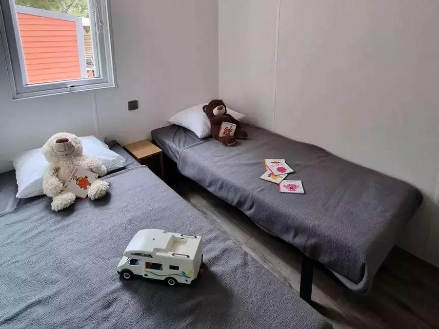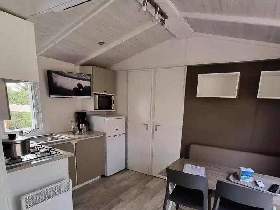 - Mobil home PORT PIN 2 chambres (29.9m²) avec climatisation réversible, télévision et lave-vaisselles. Draps INCLUS. Le mobil home est équipé de deux chambres (matelas 160x200m pour le lit double et 80x190m pour les lits simples), coin cuisine, coin salon, 1 salle de bain, et wc séparé. Volets roulants dans les chambres. Un sèche cheveux est à votre disposition dans la salle de bain.