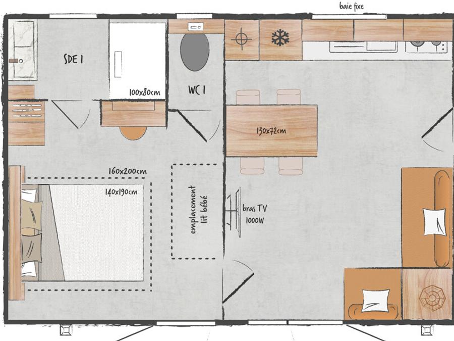 Surface, composition, chambre(s): la composition, les dimensions de l'hébergement et des couchages peuvent varier d'un logement à l'autre. Elles sont données à titre d'exemple et sont non contractuelles.