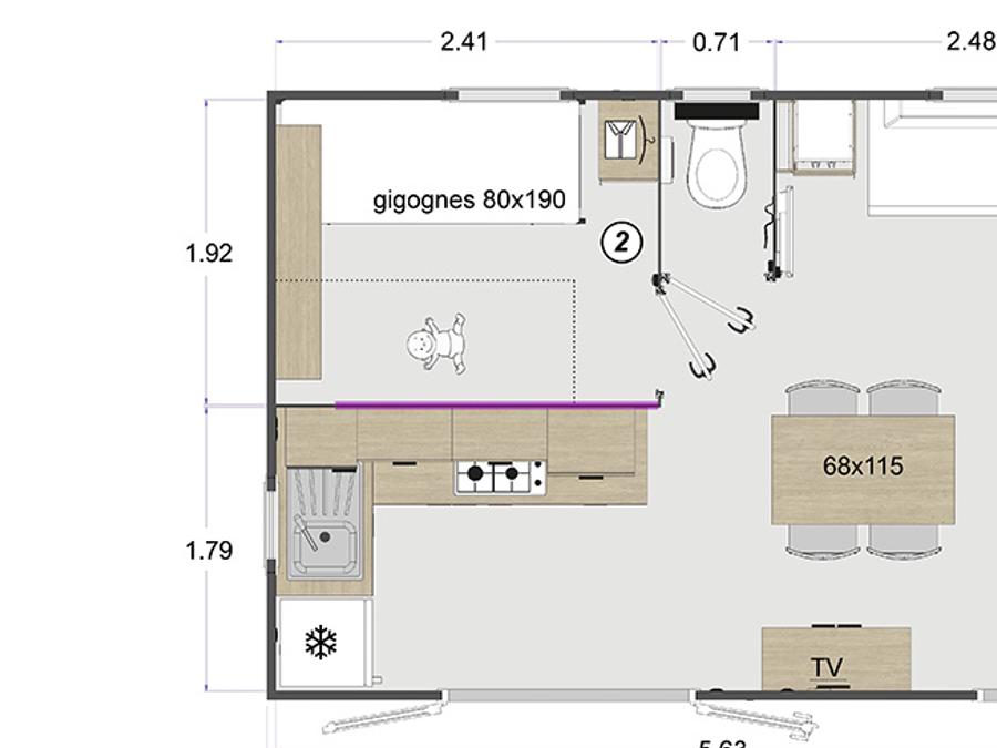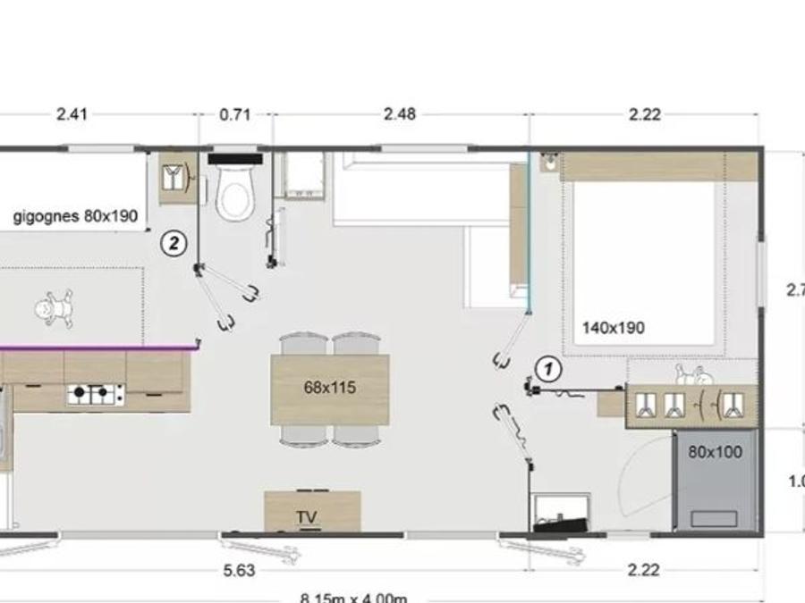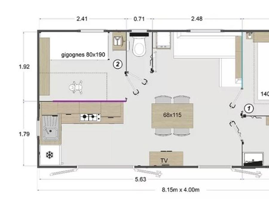 Surface, composition, chambre(s): la composition, les dimensions de l'hébergement et des couchages peuvent varier d'un logement à l'autre. Elles sont données à titre d'exemple et sont non contractuelles.