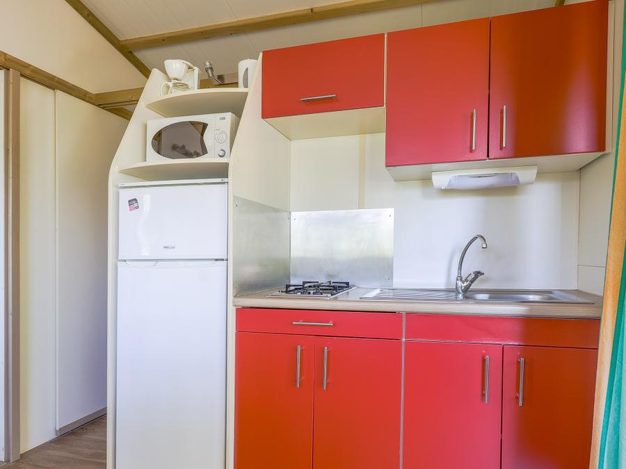 - Kitchenette équipée (kit vaisselle complet, 4 feux gaz, réfrigérateur/congélateur, micro-ondes, grille-pain, cafetière filtre & bouilloire électriques)