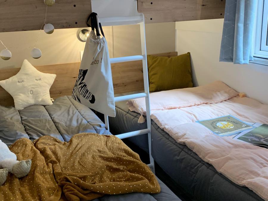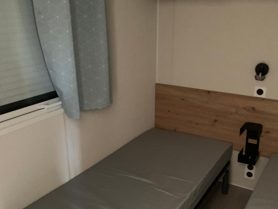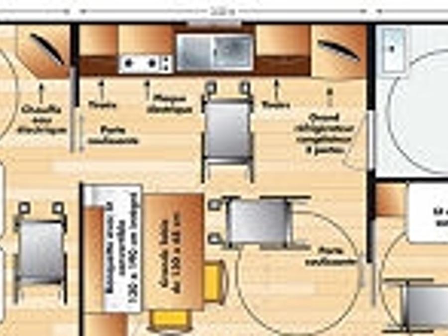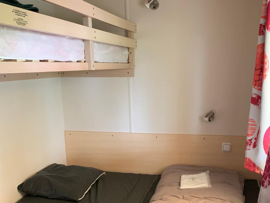 - Le Mobil home ophéa dispose de 2 chambres , la 1 ère avec un lit de 140x190 , la 2ème 2 lits supperposés 70x190, une cuisine avec frigo toble top, gazinière, micro onde, cafetière, la vaisselle pour 4 personnes , 1 salle de bain avec lavabo, douche et toilette et d'une terrasse couverte avec le salon de jardin.