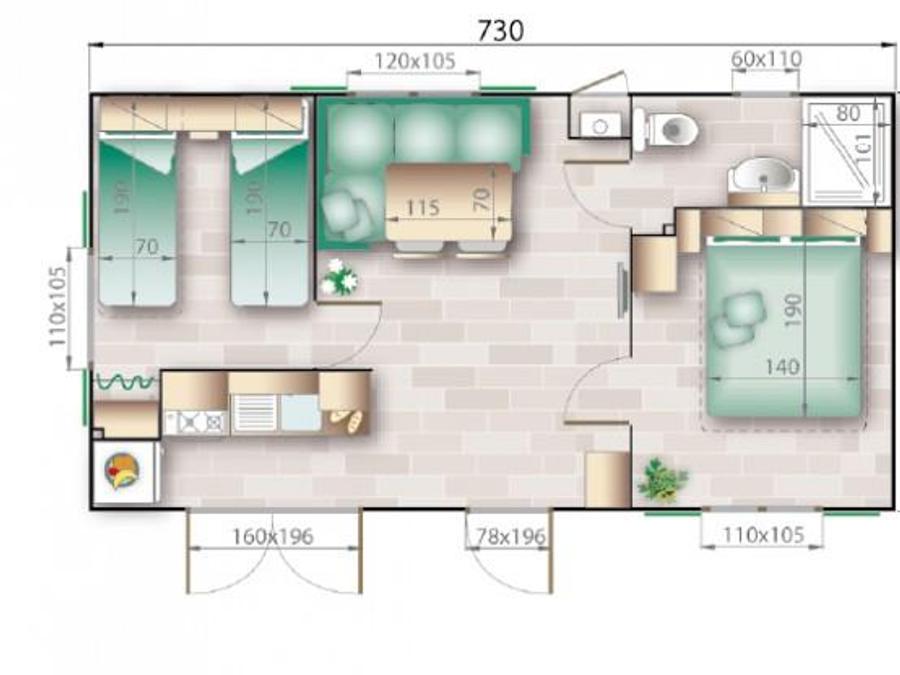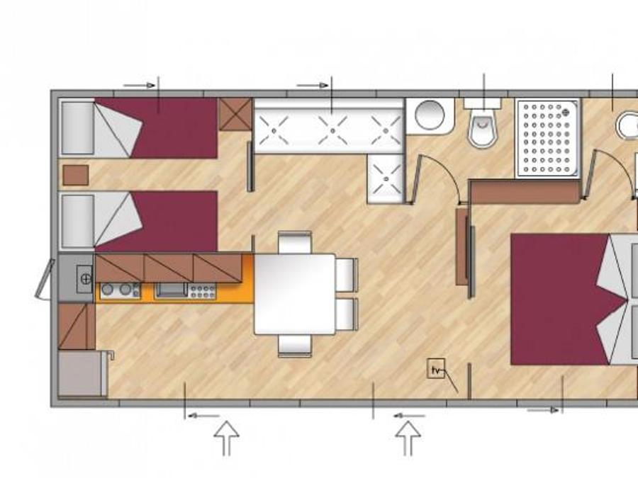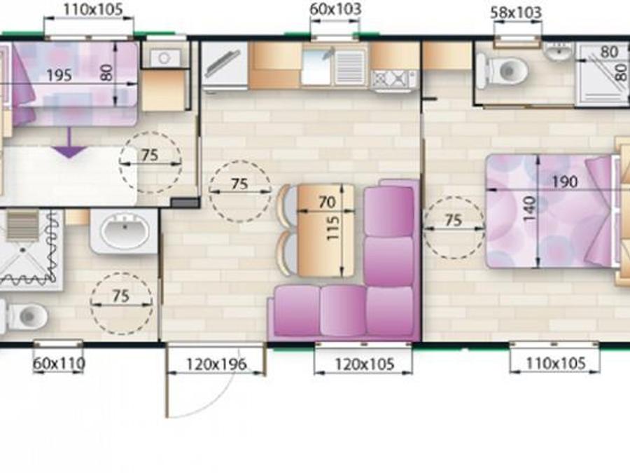 Surface, composition, chambre(s): la composition, les dimensions de l'hébergement et des couchages peuvent varier d'un logement à l'autre. Elles sont données à titre d'exemple et sont non contractuelles.