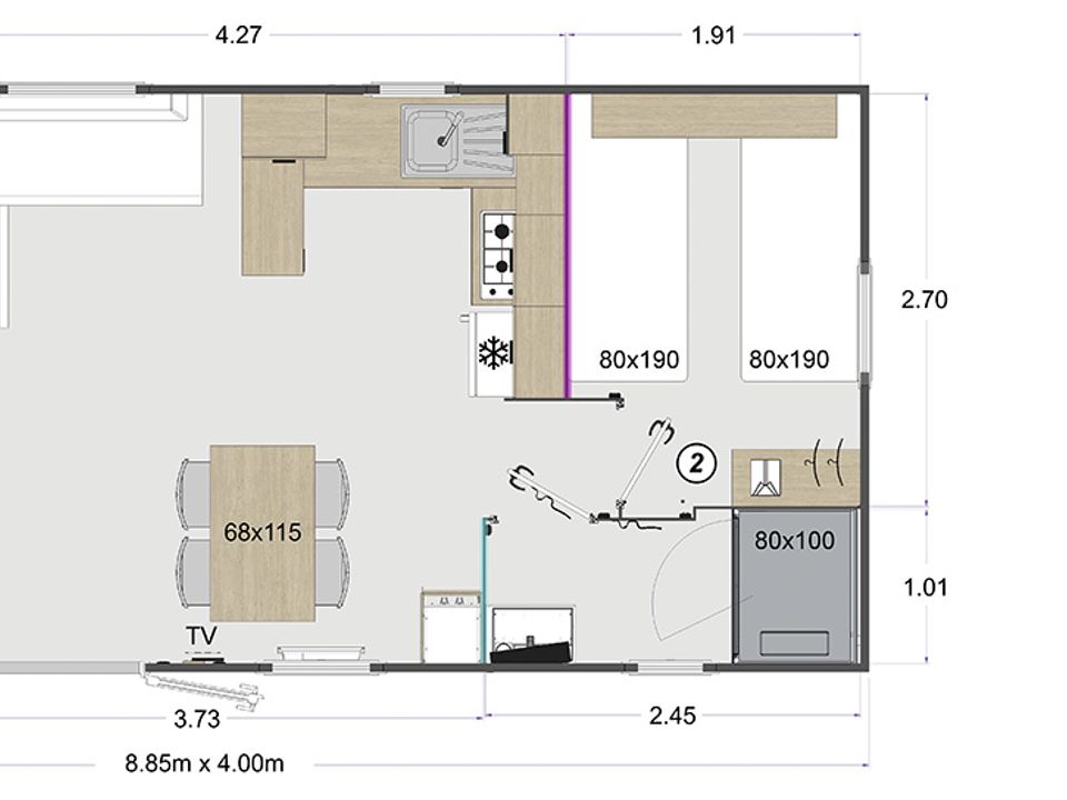 Surface, composition, chambre(s): la composition, les dimensions de l'hébergement et des couchages peuvent varier d'un logement à l'autre. Elles sont données à titre d'exemple et sont non contractuelles.