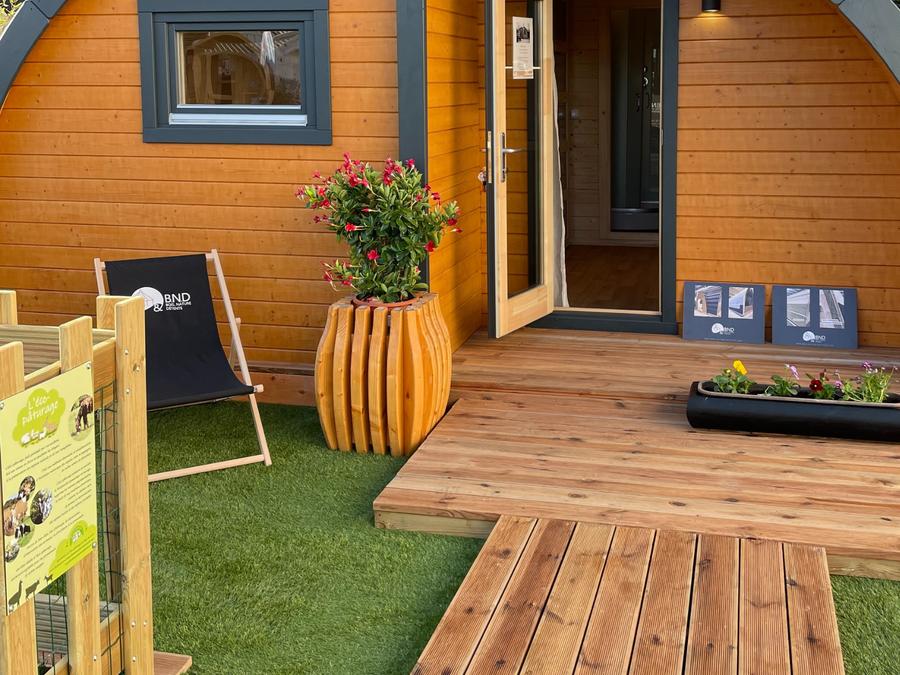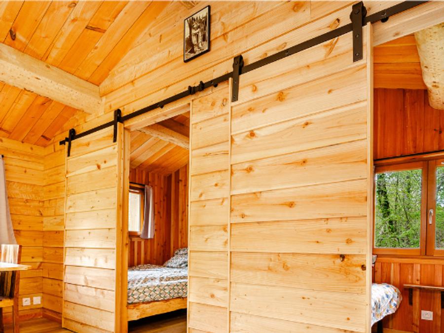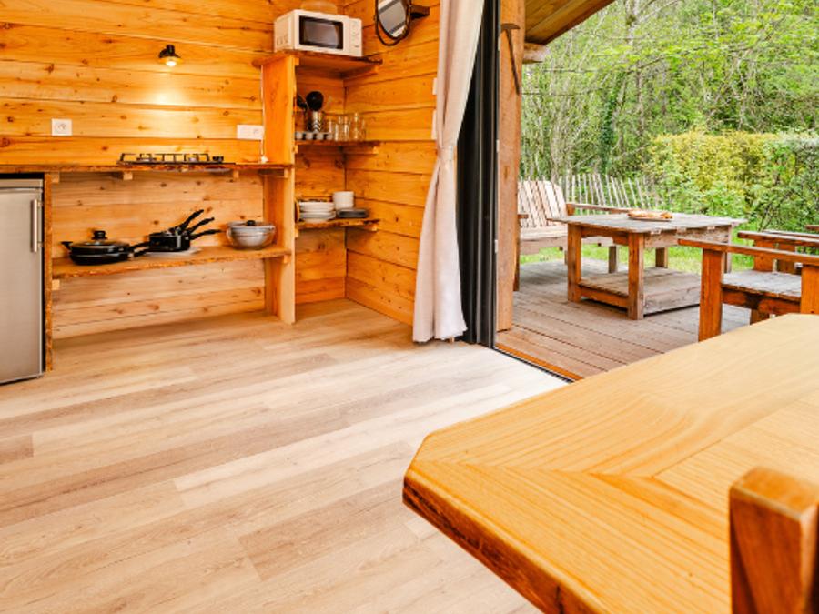 La wood-lodge dispose de 2 chambres, d’un salon et cuisine le tout pouvant s’ouvrir intégralement sur la terrasse.