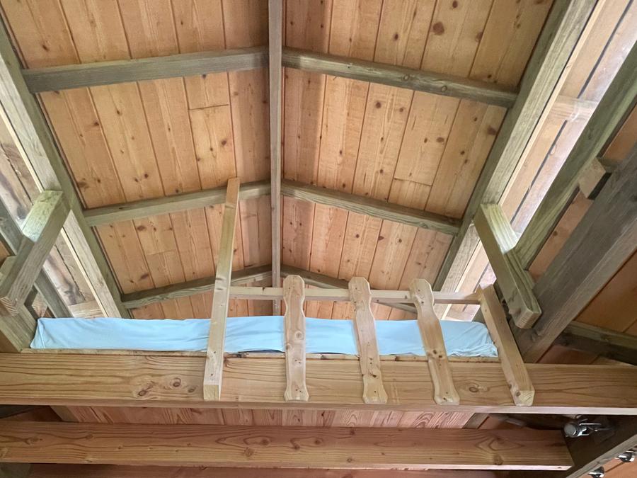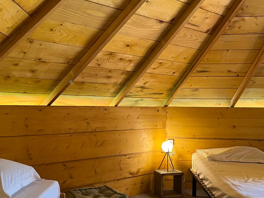 Cabane chauffée, fabrication meilleur ouvrier de France, 6 couchages (2 lits en 140, 1 lit en 120). Lit sous toiture à partir de 15 ans, échelle de meunier.