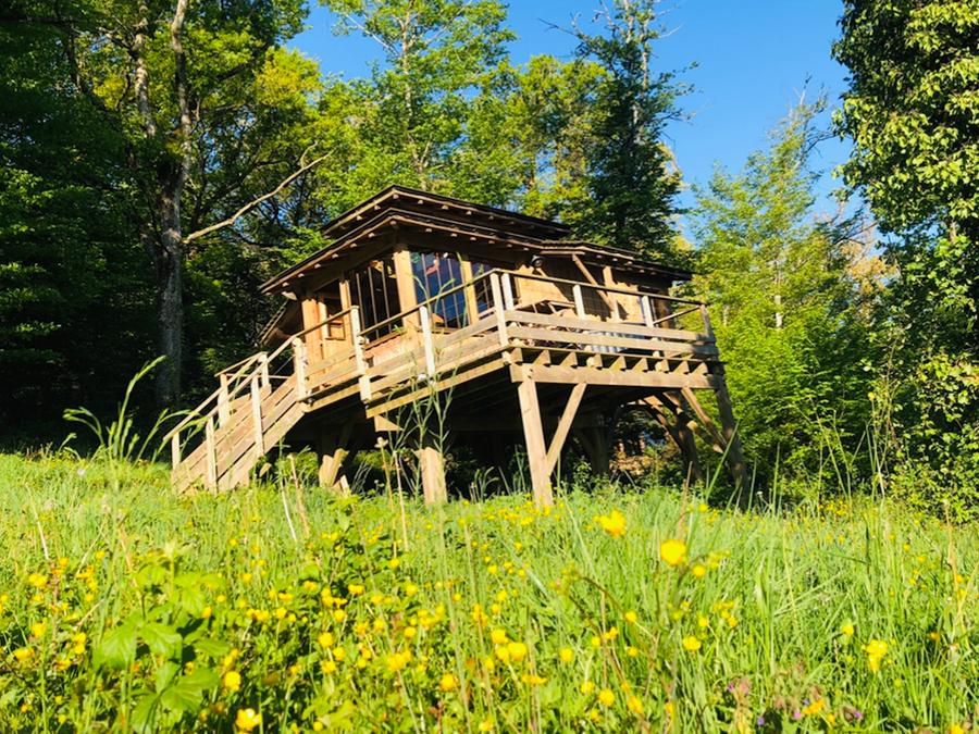 Cabane de 28 m² perchée entre 2 et 5 mètres au-dessus du sol, née du savoir-faire des Meilleurs Ouvriers de France, parfaite pour des instants magiques :