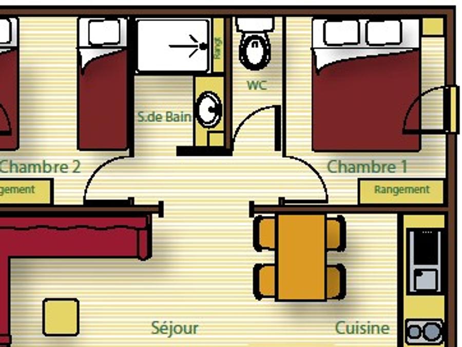 Surface, composition, chambre(s): la composition, les dimensions de l'hébergement et des couchages peuvent varier d'un logement à l'autre. Elles sont données à titre d'exemple et sont non contractuelles.