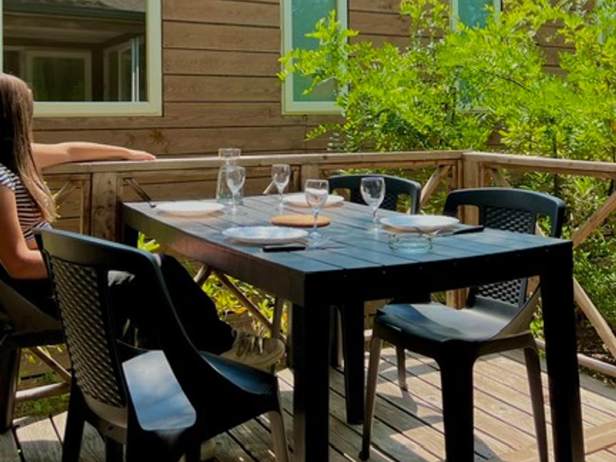 A l’extérieur : Terrasse semi-ombragée, table et chaises.