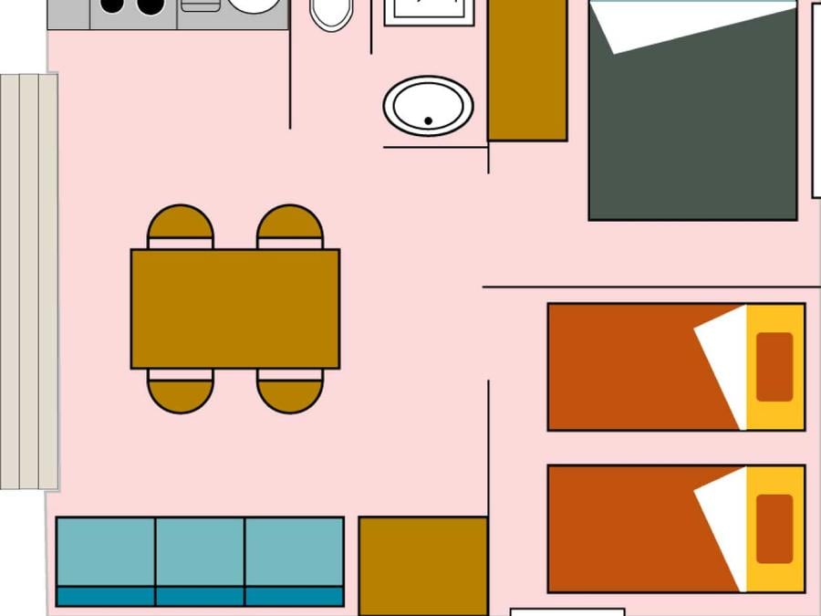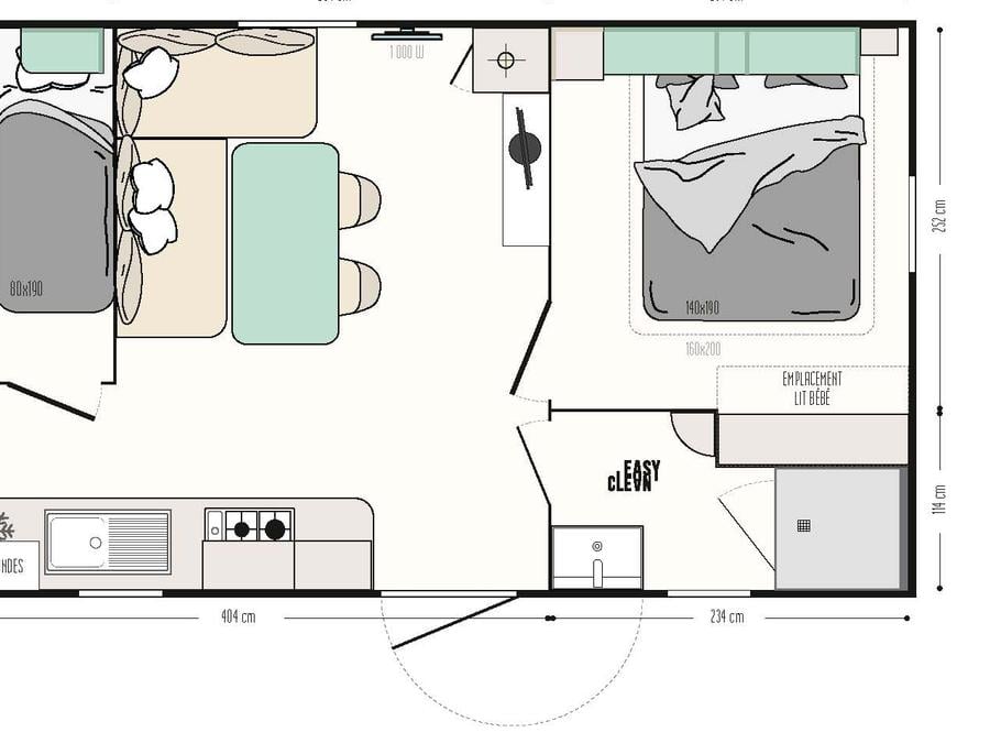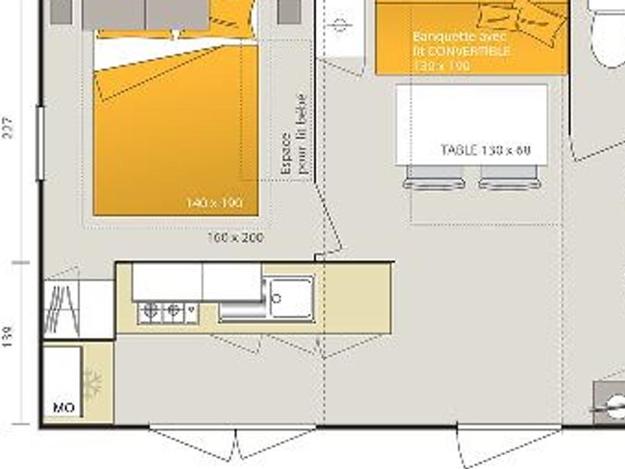 Surface, composition, chambre(s): la composition, les dimensions de l'hébergement et des couchages peuvent varier d'un logement à l'autre. Elles sont données à titre d'exemple et sont non contractuelles.
