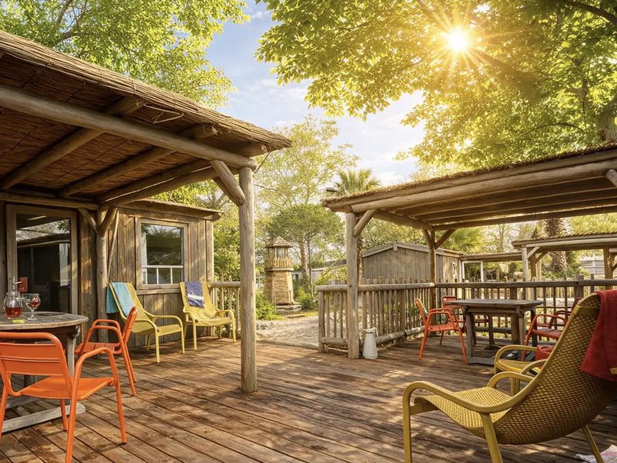 Les hébergements disposent soit d'une terrasse intégrée et surélevée, soit d'une terrasse au sol (uniquement pour le modèle 4 personnes classique!)