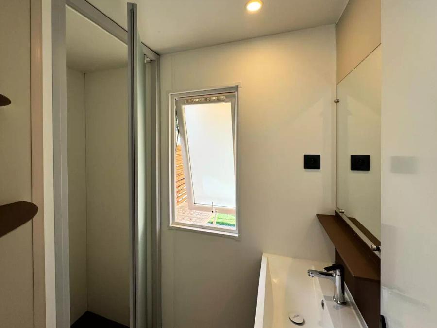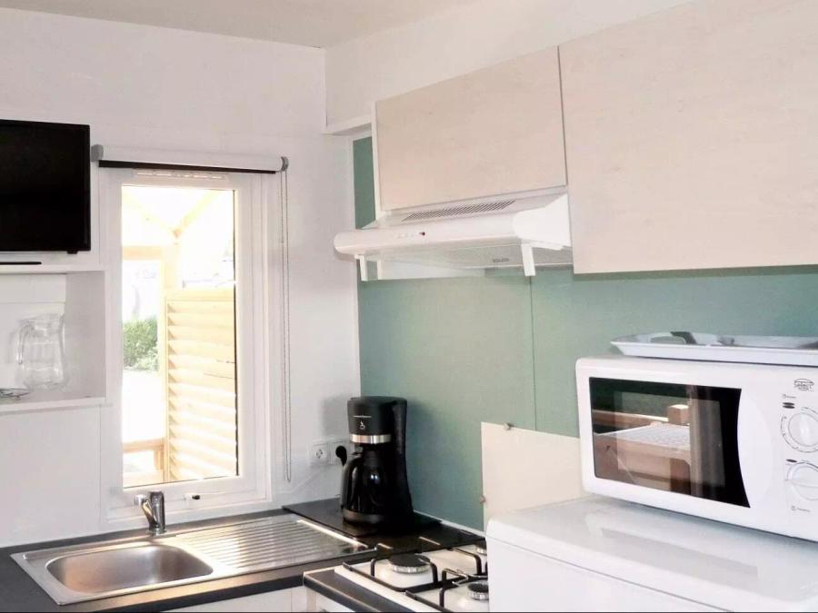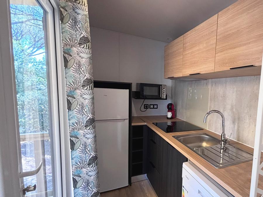 Suite parentale séparée du salon par un rideau, une banquette au salon, cuisine équipée, réfrigérateur, micro-ondes, grille-pain, bouilloire, cafetière à capsules (Dolce Gusto), lave-vaisselle, coin repas, parure de draps jetables pour 2 personnes, couette + oreillers, vaisselle, salle d’eau spacieuse avec WC et douche XXL à l’italienne, tapis de douche, sèche serviettes, sèche-cheveux, salon de jardin cosy, transats. Barbecue électrique autorisé