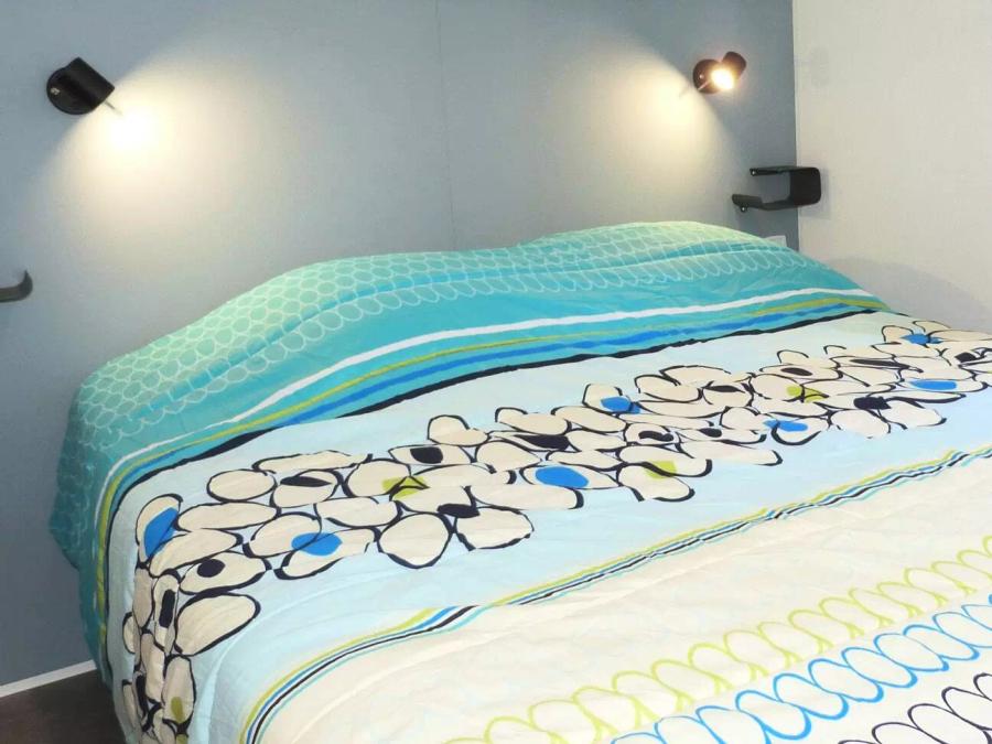 Une chambre avec 1 grand lit (140cm x 190cm), une chambre avec 2 lits simples (80cm x 190cm), salle d’eau, WC séparés, couettes + oreillers, réfrigérateur, cuisine équipée, micro-ondes, cafetière à capsules (Dolce Gusto), coin repas, vaisselle, salon de jardin. Barbecue électrique autorisé
