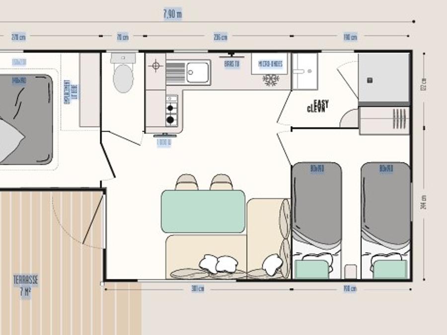 Surface, composition, chambre(s): la composition, les dimensions de l'hébergement et des couchages peuvent varier d'un logement à l'autre. Elles sont données à titre d'exemple et sont non contractuelles.