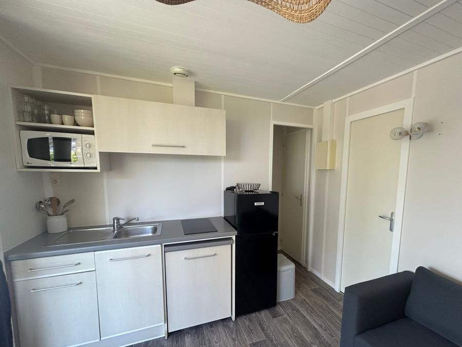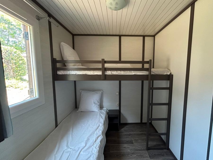Chalet spacieux avec terrasse privative, cuisine équipée (machine à café, grille-pain, bouilloire, ustensiles), salon ouvert, 1 chambre avec lit double (140x200), 1 chambre avec 2 lits simples (80x190), 1 chambre avec lits superposés (2x 80x190), salle de bain, toilettes séparées.