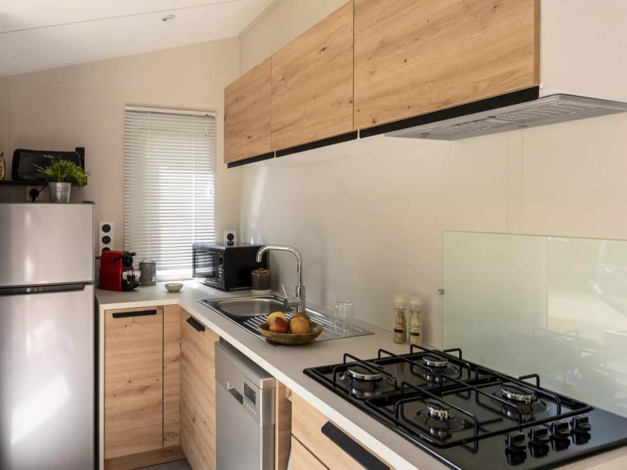 - Kitchenette toute équipée (kit vaisselle complet, 4 feux gaz, réfrigérateur/congélateur, lave-vaisselle, micro-ondes, grille-pain, cafetière à filtre & bouilloire électriques)