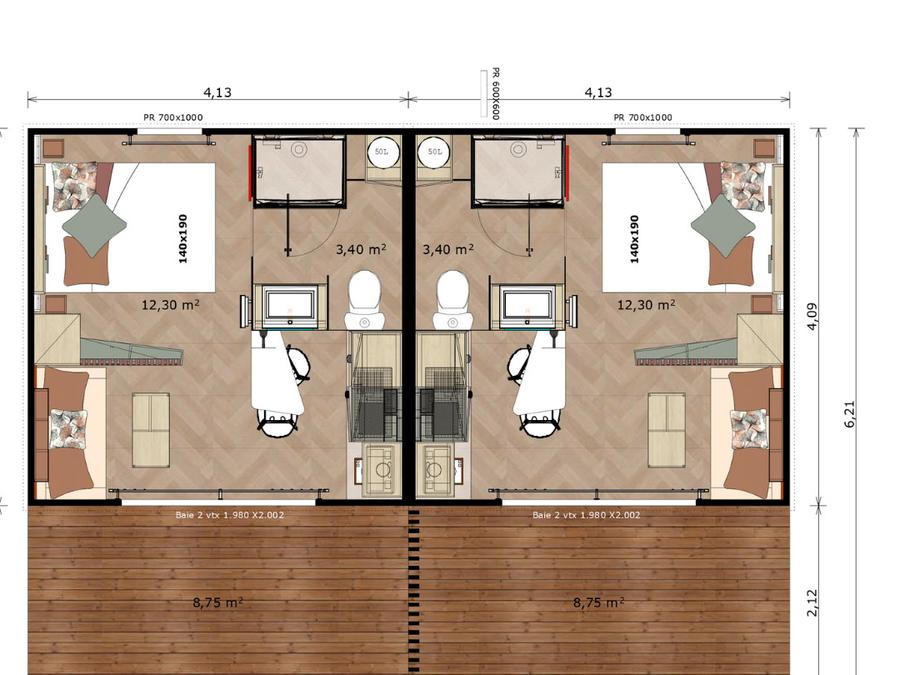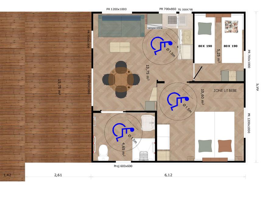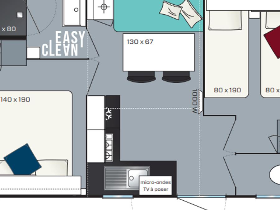 Surface, composition, chambre(s): la composition, les dimensions de l'hébergement et des couchages peuvent varier d'un logement à l'autre. Elles sont données à titre d'exemple et sont non contractuelles.