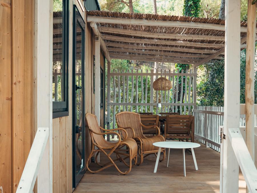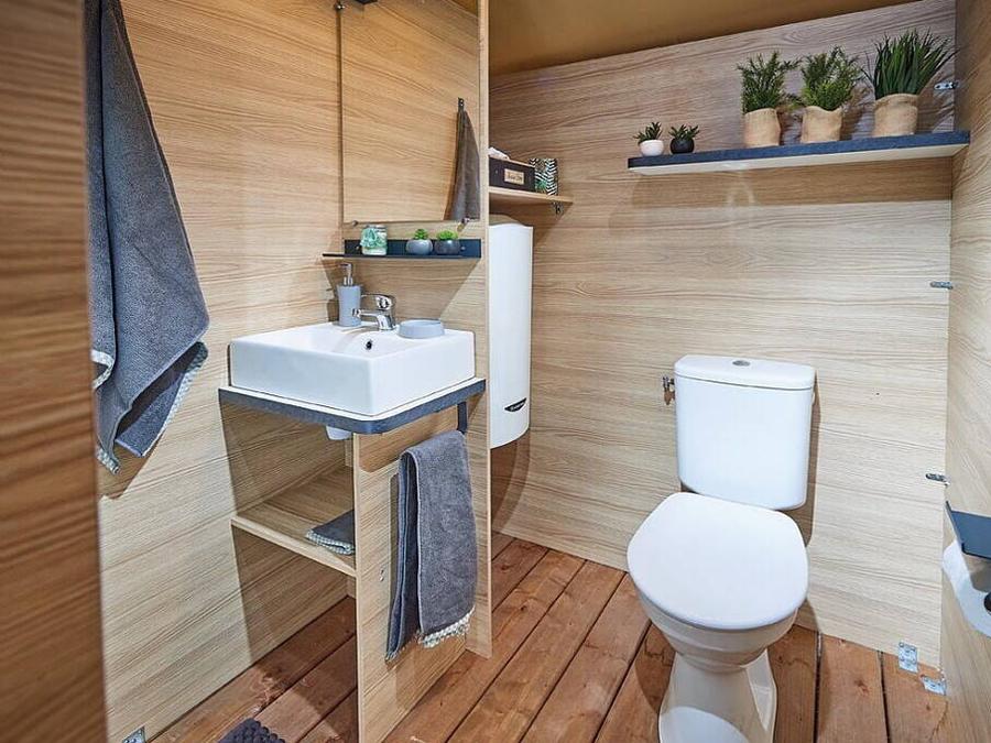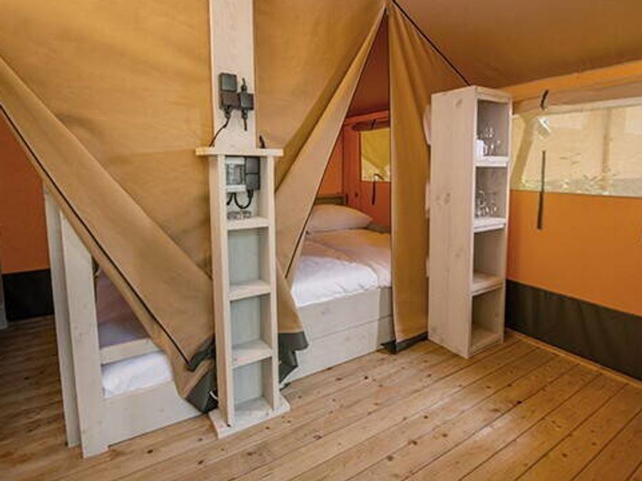 - La Tente Lodge Deluxe est équipée de tout le confort : elle dispose d'une chambre double, d'une deuxième chambre avec 1 lit simple et un lit superposé, d'une salle de bain avec cabine de douche et lavabo. Il a une grande superficie de 28m2 et le salon avec cuisine, lorsque les rideaux du devant sont ouverts, ne fait plus qu'un avec la grande terrasse extérieure. La tente n'a pas de climatisation. Animaux non admis. Il n'y a PAS de climatisation ni de chauffage.