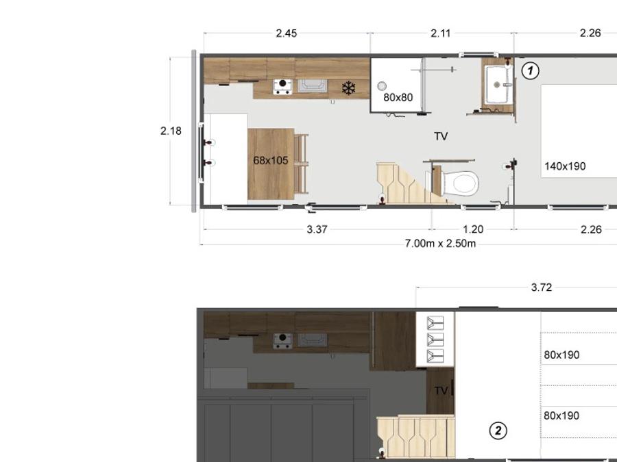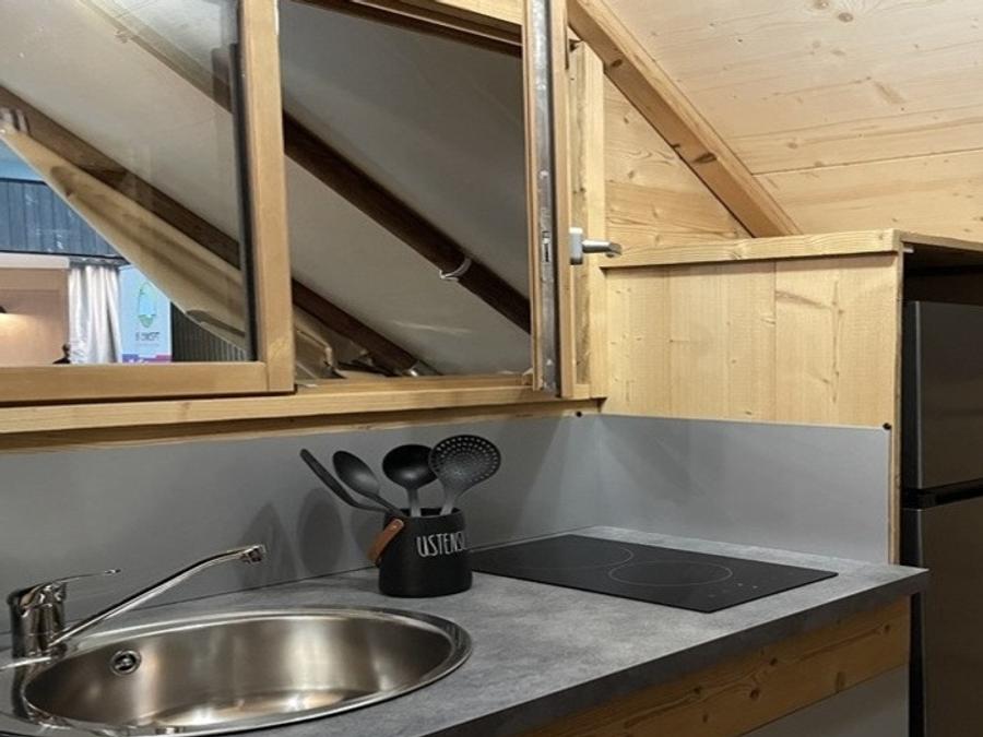 - Confort, détente et glamping peuvent être résumés en deux mots : notre nouvelle Tiny House. Un espace « minuscule » mais doté de tout le confort nécessaire, comme une cuisine équipée d'un micro-ondes, d'un réfrigérateur et d'un congélateur, et enfin de quatre plaques à induction. Elle se caractérise par des intérieurs en bois délicats et tamisés, qui contribuent à la sensation de détente. Dans le salon, vous trouverez une table rabattable qui peut servir d'étagère, un petit canapé et, en face, deux escaliers de chaque côté qui mènent à la chambre double et à la chambre avec deux lits simples. De plus, les Tiny Houses sont équipées d'une salle de bain avec douche et chauffage au sol, parfaite pour maintenir une ambiance confortable même pendant les journées froides et maussades. Elles comprennent également la climatisation qui peut également servir de chauffage. Animaux non admis.
