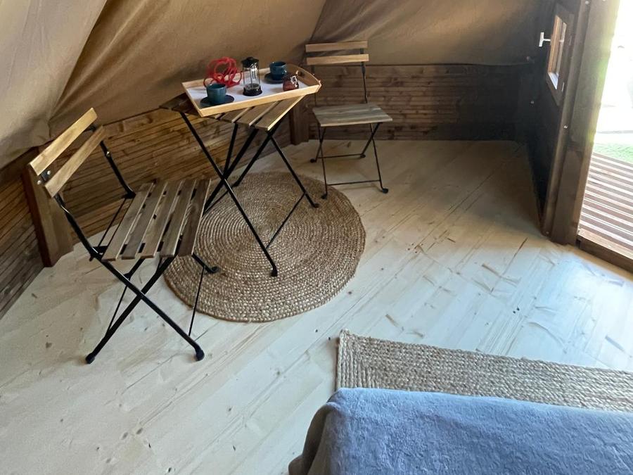 - L'Air Lodge est une tente de glamping spacieuse avec ses 12 mètres carrés au rez-de-chaussée et ses 12 mètres carrés au premier étage. Elle dispose d'une chambre principale au premier étage avec un lit double et une vue sur le ciel, et d'un deuxième lit double au rez-de-chaussée. Il dispose d'une kitchenette et d'une salle de bains avec douche. A l'extérieur, il dispose d'une grande terrasse en bois avec mobilier de jardin. Animaux non admis.