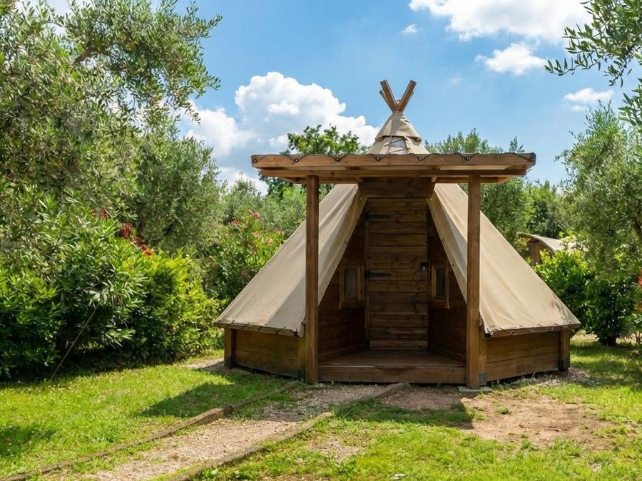 - Le Tipi Junior est une tente très simple, idéale pour ceux qui recherchent un séjour basique en contact avec la nature. À l'intérieur, vous trouverez deux lits simples. La tente dispose d'un mini-réfrigérateur, d'une plaque électrique et d'un petit équipement de cuisine, adapté à des préparations simples. Pas de climatisation ni de chauffage ? Pas de problème ! Grâce à sa conception spéciale, le Tipi Junior garantit tout de même un séjour agréable et confortable. Malheureusement, les animaux domestiques ne sont pas admis dans cet hébergement, mais en contrepartie, vous pouvez profiter de l'accès aux piscines et aux animations, deux services toujours inclus dans le prix !