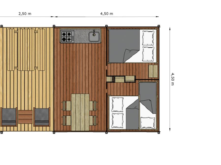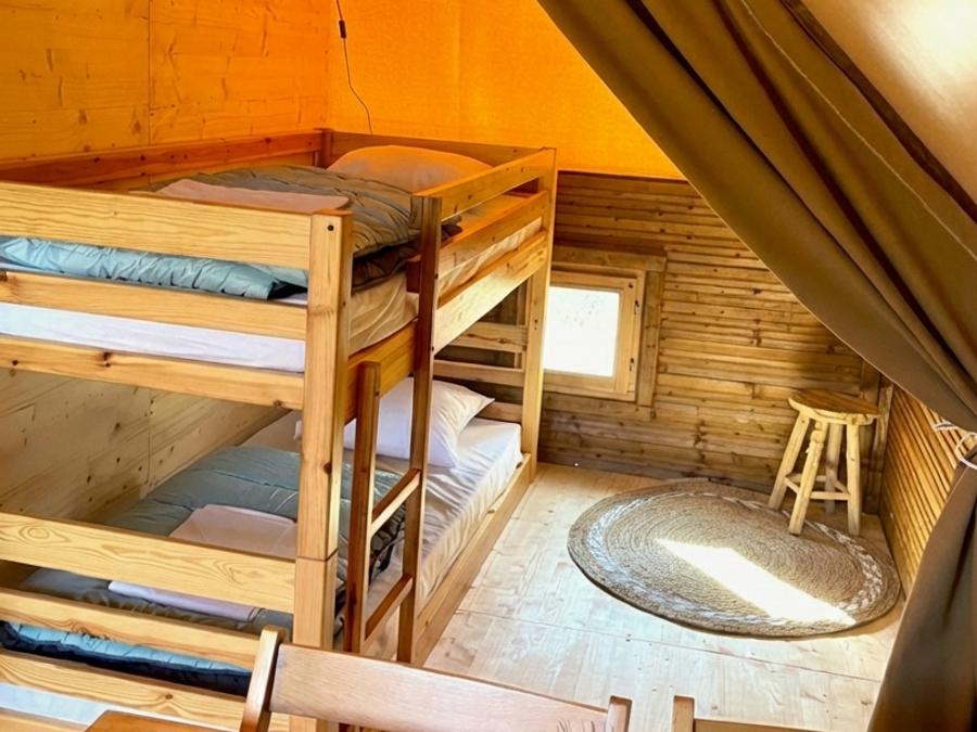 - Notre Safari Lodge All Season allie le charme de l'aventure dans la nature au confort d'une vraie maison. Spacieux et lumineux, il peut accueillir jusqu'à 5 personnes et est conçu pour offrir un séjour confortable en toute saison, étant équipé de la climatisation/pompe à chaleur. Il dispose de deux chambres séparées, meublées avec soin, idéales pour les familles, les couples ou les petits groupes. L'une dispose d'un grand lit double et l'autre d'un lit simple et d'un lit superposé. À l'intérieur, vous trouverez une salle de bains complète, moderne et fonctionnelle, équipée de toutes les commodités essentielles, ainsi qu'une cuisine entièrement équipée qui vous permettra de profiter de votre séjour en toute autonomie. Les espaces sont conçus pour offrir une grande praticité sans compromettre le style, avec des matériaux naturels et des finitions raffinées. Un refuge parfait pour ceux qui veulent s'immerger dans la nature. Malheureusement, les animaux domestiques ne sont pas admis dans cet hébergement, mais vous pouvez toujours profiter de l'accès aux piscines et aux animations, deux services toujours inclus dans le prix !