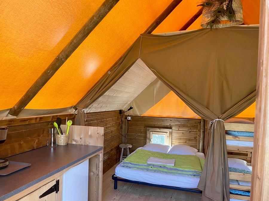 - La Glamptent 2.0 est la solution idéale pour ceux qui souhaitent profiter de la nature sans renoncer au confort. Spacieuse et fonctionnelle, cette tente de glamping est équipée d'une porte verrouillable pour garantir votre intimité et votre sécurité pendant votre séjour. À l'intérieur, vous trouverez deux chambres, l'une avec un lit double et la seconde avec un lit simple et des lits superposés, parfaite pour les familles ou les petits groupes. La tente ne dispose pas de salle de bain, de climatisation ni de chauffage, offrant une expérience authentique et simple dans un véritable style outdoor. Cependant, elle dispose d'une cuisine entièrement équipée avec un évier et l'eau courante, idéale pour préparer vos propres repas. La Glamptent 2.0 est conçue pour ceux qui aiment le glamping essentiel : un confort pratique, une atmosphère naturelle et la liberté de profiter du plein air en toute détente. Malheureusement, les animaux domestiques ne sont pas admis dans cet hébergement, mais nous avons une bonne nouvelle pour vous : les piscines et les animations sont toujours incluses dans le prix !