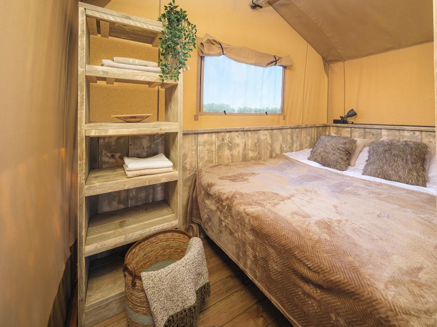 - Le Safari Lodge est une magnifique tente avec beaucoup d'espace, à l'extérieur comme à l'intérieur. À l'intérieur, il y a une chambre double au rez-de-chaussée, une salle de bains et un salon avec cuisine, tandis qu'à l'étage, trois lits simples font le bonheur des plus petits, qui ont ainsi leur propre espace. À l'extérieur, il y a une véranda avec des meubles en bois. Les animaux ne sont pas admis.