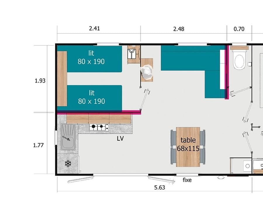 Surface, composition, chambre(s): la composition, les dimensions de l'hébergement et des couchages peuvent varier d'un logement à l'autre. Elles sont données à titre d'exemple et sont non contractuelles.