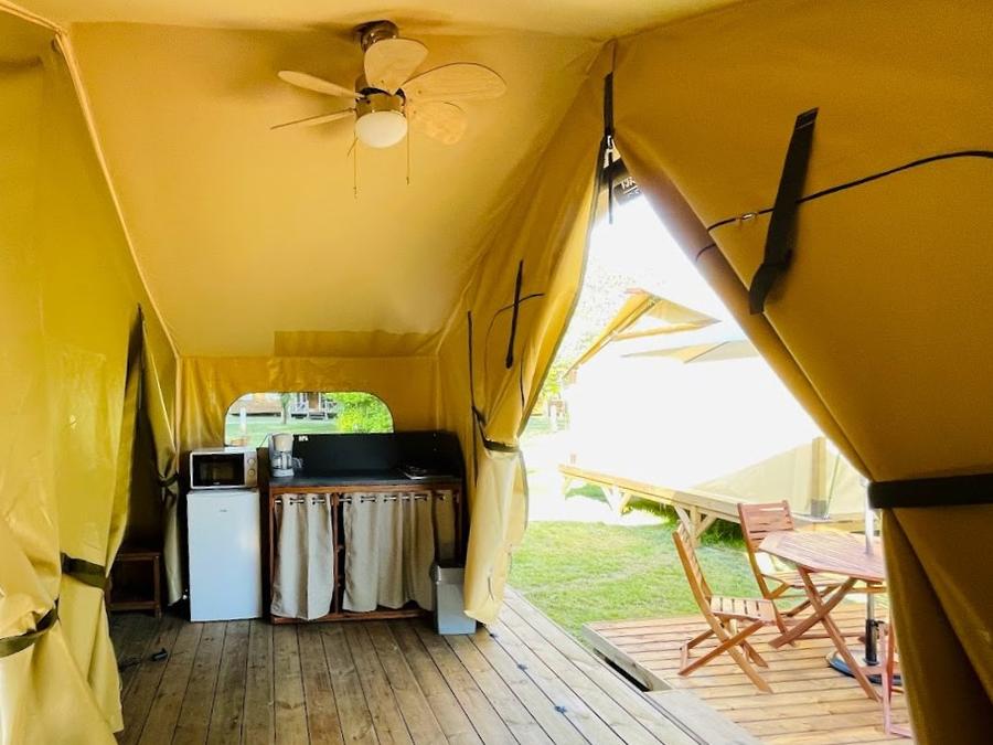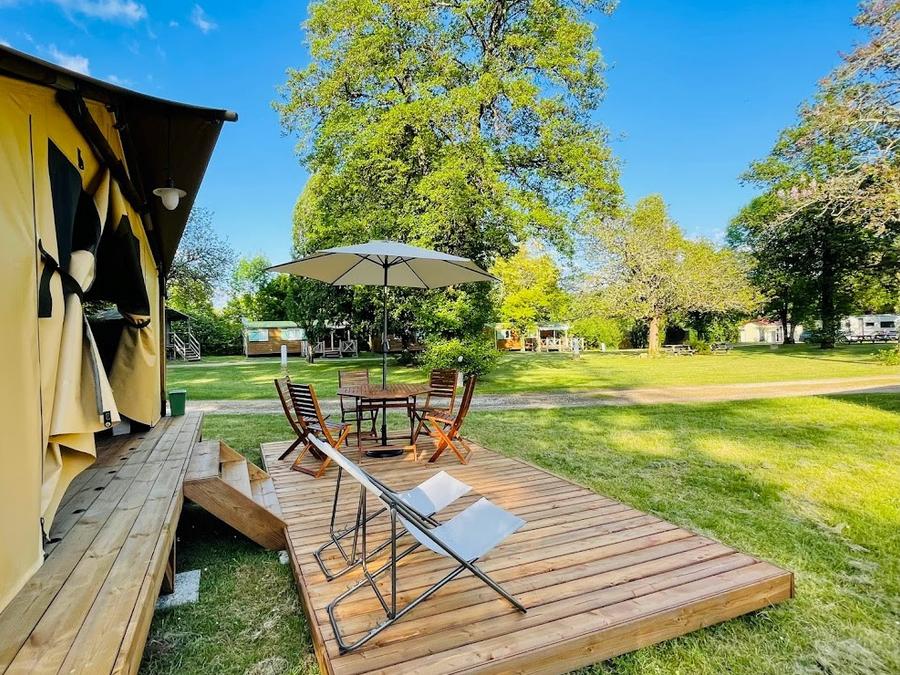 Tente en toile et en bois 4 personnes - Lodge Taïga / 2 chambres / avec sanitaires - terrasse sur pilotis