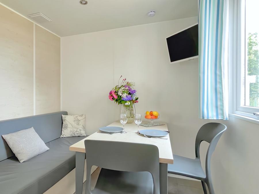 - Un séjour/salon avec banquette, table et télévision.