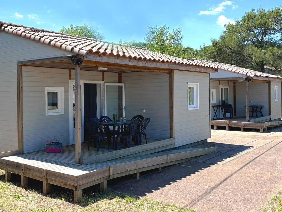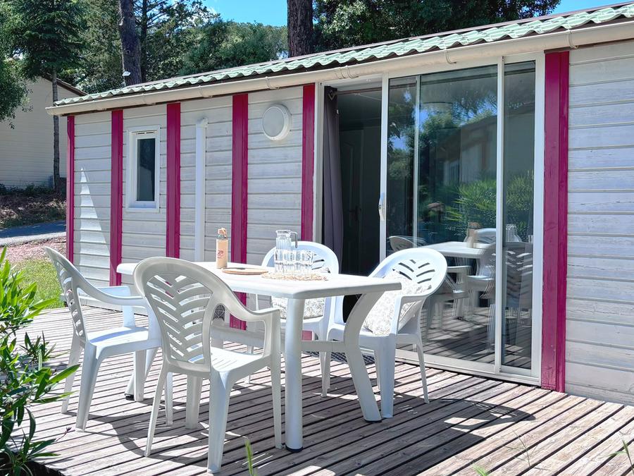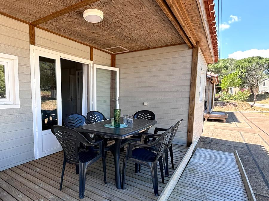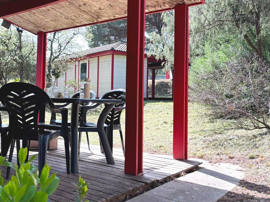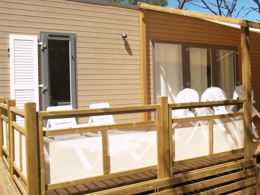 - La terrasse en bois est soit surélevée, soit au sol selon les modèles.