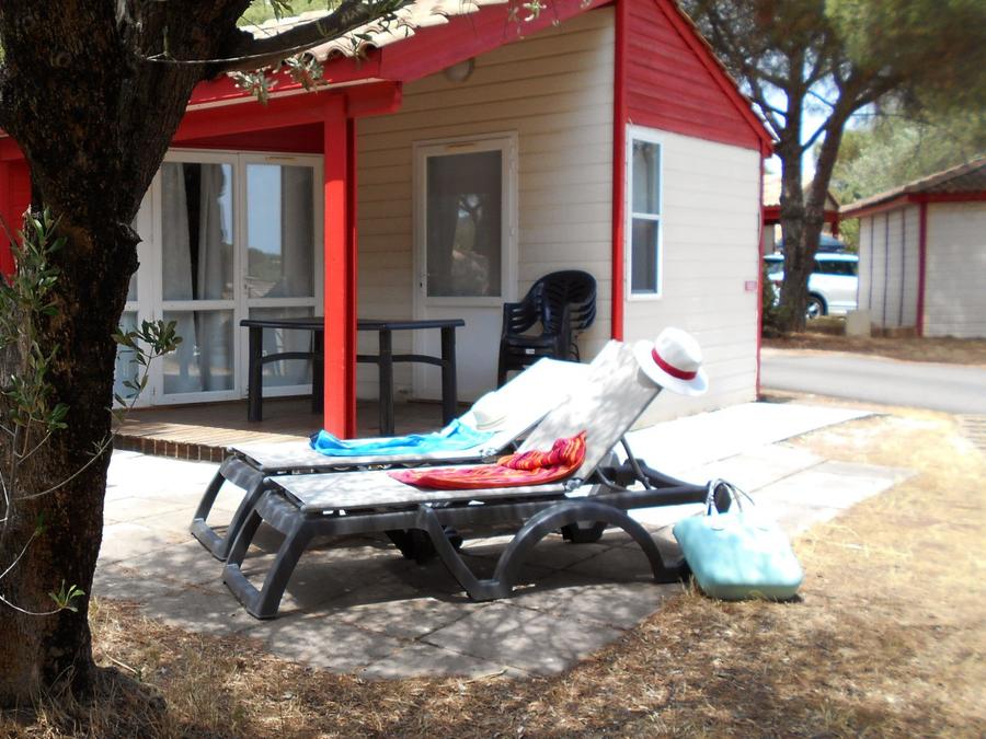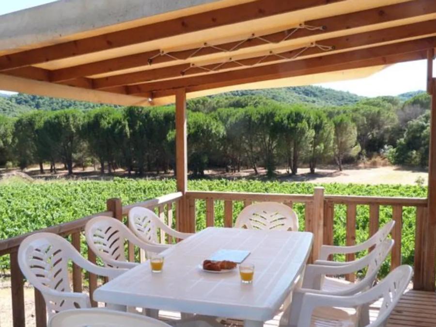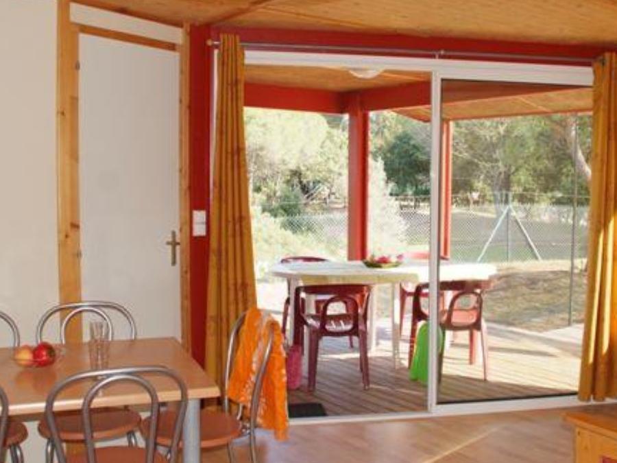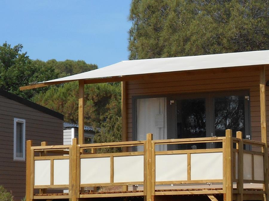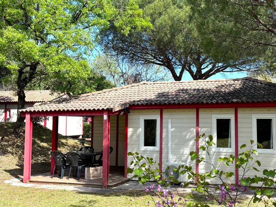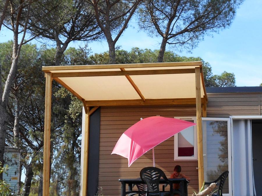 - La terrasse en bois est soit surélevée, soit au sol selon les modèles.