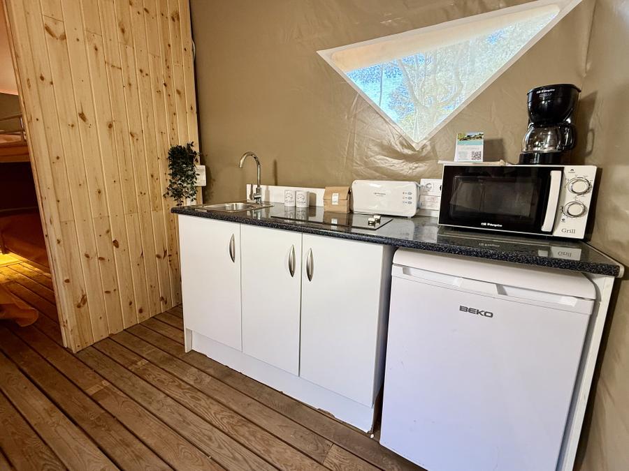 - Kitchenette équipée (kit vaisselle complet, 4 feux gaz, réfrigérateur avec partie congélateur, micro-ondes et cafetière électrique à filtre)