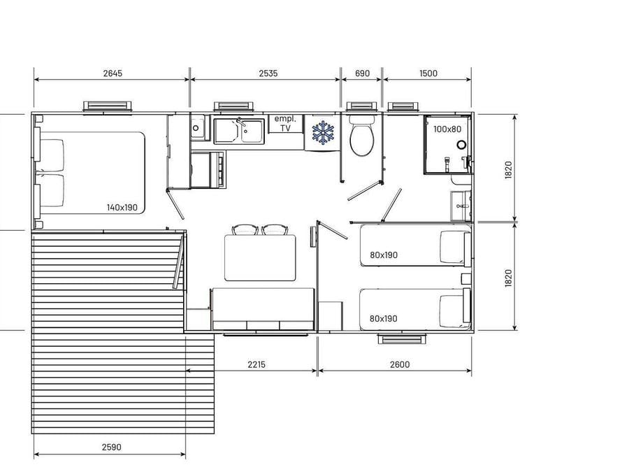 Mobilhome 6 personnes - Confort | 3 Ch. | 6 Pers. | Terrasse surélevée | 1 SDB | Clim. | TV