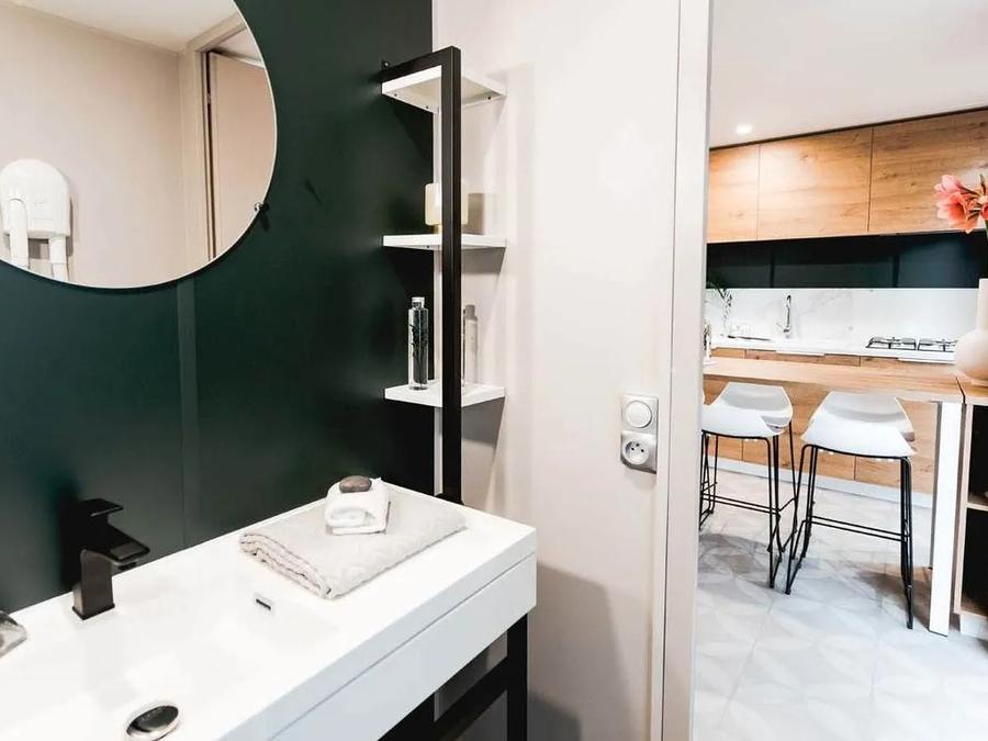 - Salle d’eau avec douche, lavabo et radiateur sèche-serviettes