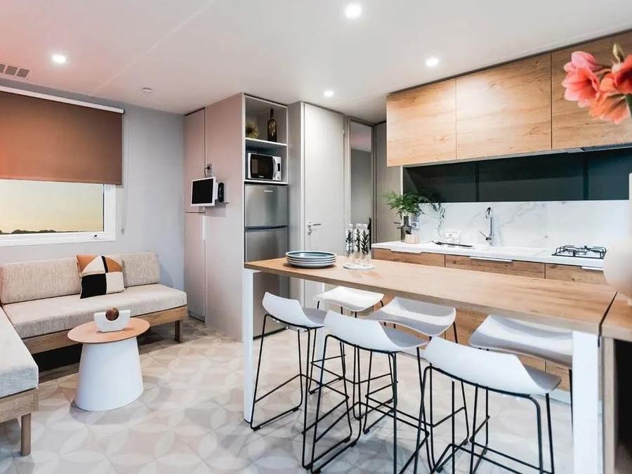 - Kitchenette équipée (kit vaisselle complet, 4 feux gaz, réfrigérateur et congélateur, lave-vaisselle, micro-ondes, grille-pain & cafetière à filtre électrique)