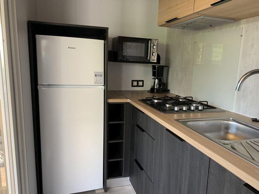 - Kitchenette équipée (kit vaisselle complet, 4 feux gaz, réfrigérateur avec mini freezer, micro-ondes, cafetière électrique à filtre)