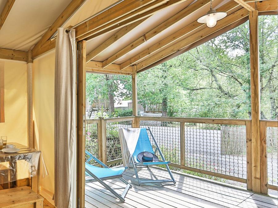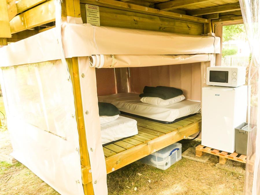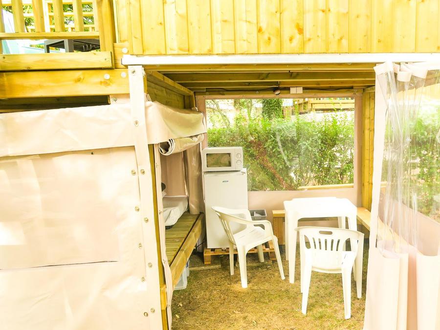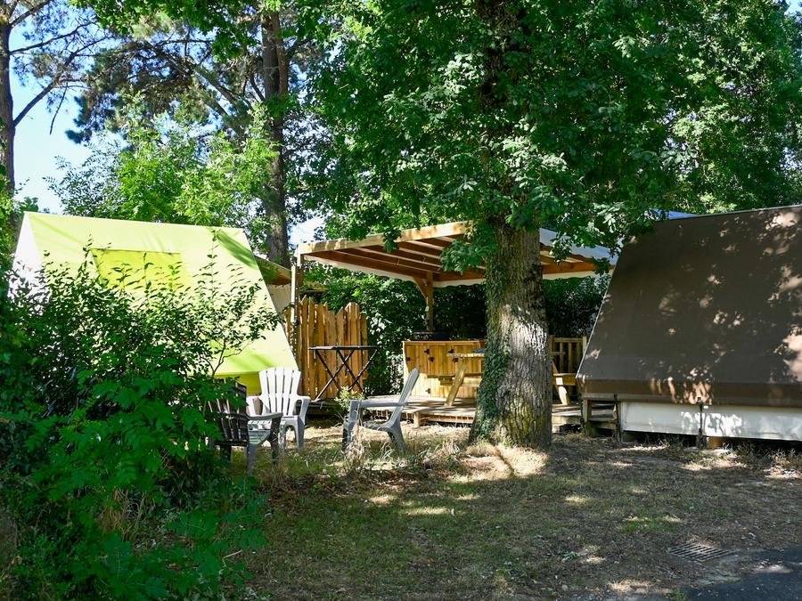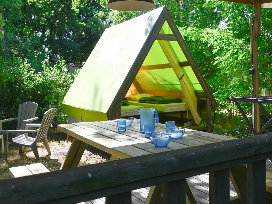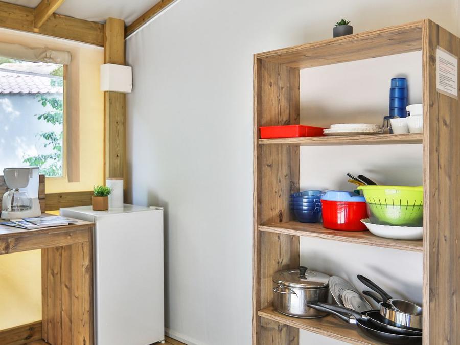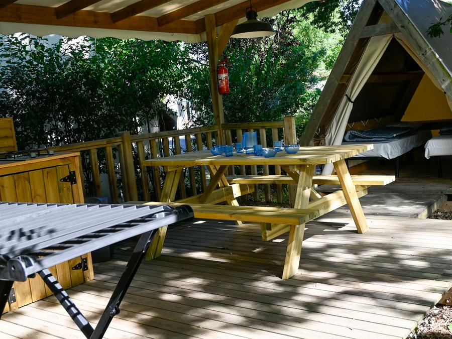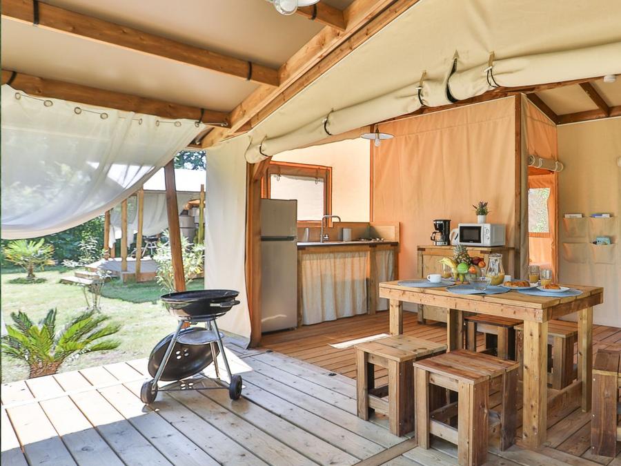 Ces tentes sont équipés d'un coin cuisine avec réfrigérateur, cafetière électrique, micro-onde, vaisselle, d'une table et de 4 fauteuils de jardin et d'un barbecue charbon.