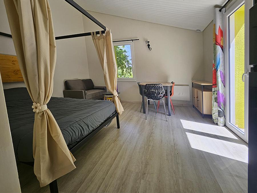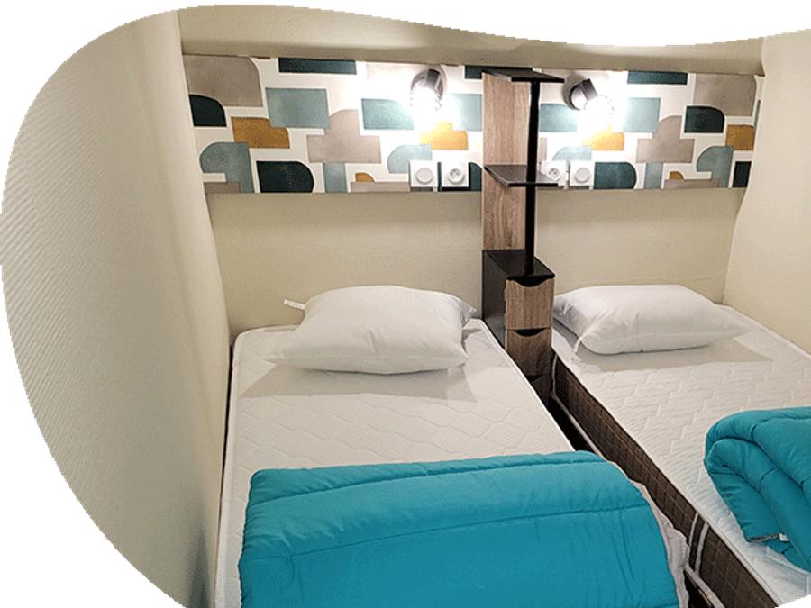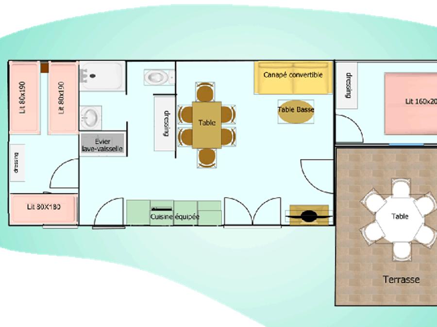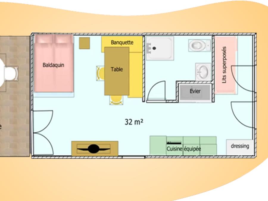 - Pour vous offrir des vacances standing dans notre camping, nos locations « Cottage family » de 44m² sont dotées de 2 chambres et d’une grande terrasse aménagée.
