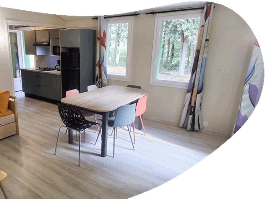 Cette jolie résidence de vacances vous offre un grand séjour Cocooning avec canapé gigogne convertible en lit 2 places, tables, chaises et rangements.