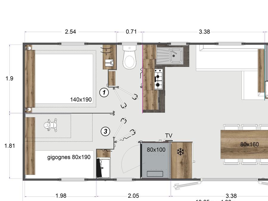 Mobilhome 8 personnes - Prestige Smala - 4 chambres - 2 salles de bains - 2 WC - CLIM - TV + Lave vaisselle
